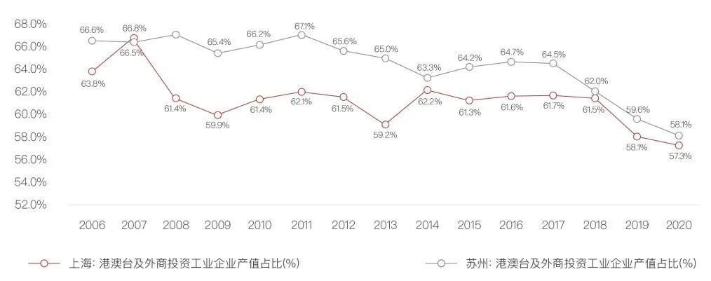 另一方面,苏州的外商工业总产值占比也优于上海。作为地级市的苏州自2006年以来港澳台和外商投资的工业企业产值占比就一直高于上海(上海保持在60%左右)。