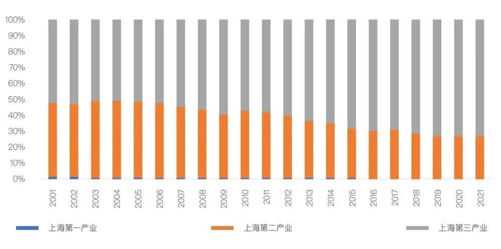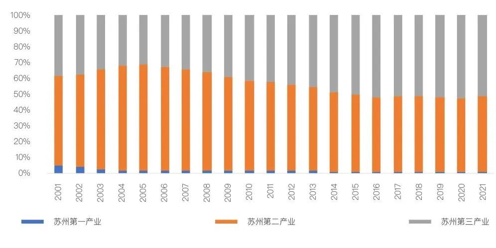 图:上海(上图)和苏州(下图)三大产业占GDP比重变化