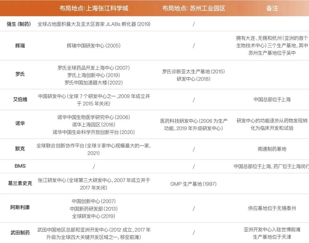 表:10大生物制药企业在张江科学城和苏州工业园区的布局