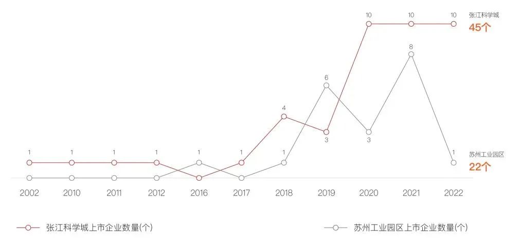 从上市时间切入,张江首个上市企业(2002年)足足比苏州工业园区(2016年)提前了约14年。