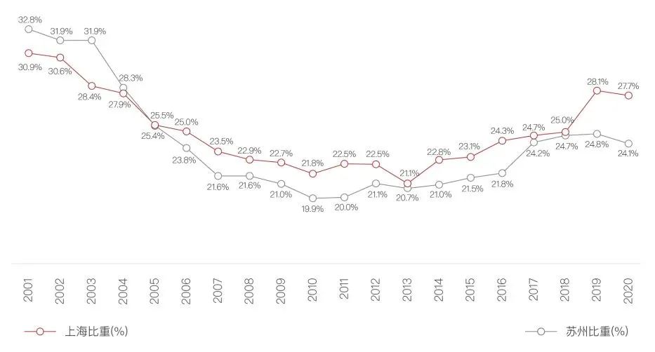 两大城市在2007年以后都有着二产比重下降、三产比重提升的产业升级趋势,但相较之下苏州的二产比重(50%)仍然明显高于上海(30%),也从侧面体现出苏州重二产、上海重三产的产业结构。