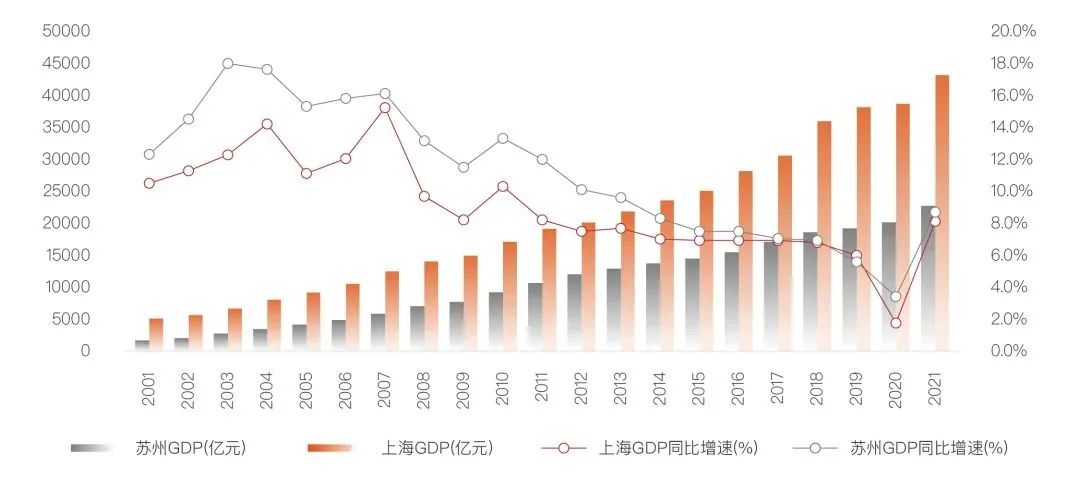 2021年上海的GDP达到了43214亿元,苏州为22718亿元,约为上海GDP的52%,而该比重在2001年时仅为34%,可见过去20年间苏州的经济规模有了飞速的提升。