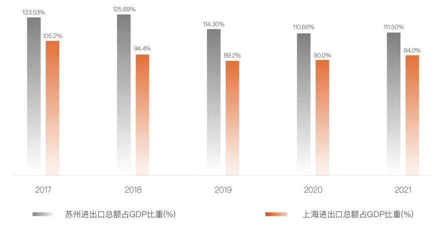 一方面苏州进出口总额对GDP的拉动优于上海:2017年以来苏州的进出口总额占GDP的比值均高于上海,且高于100%。