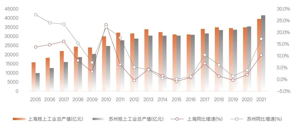 具体到工业总产值数据。2021年苏州的工业总产值首次超过了上海,达到了41308亿元,而在过去15年间其产值同比增速一直远高于上海,且2021年的产值增速差仍然大于5%,可见在短时间内工业的高速发展依然是苏州的发展重点。