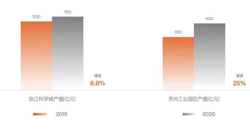 2020年苏州工业园区的生物医药总产值为1000亿元,同年张江科学城的产值为1100亿元,两大园区的产业发展可以用“比肩”来形容。此外,苏州工业园区近年来发展速度飞快。一方面,产值增速快于张江。2020年苏州工业园区生命科学的产值相较2019年增加了25%;同年张江科学城的工业产值增速仅为6.8%。
