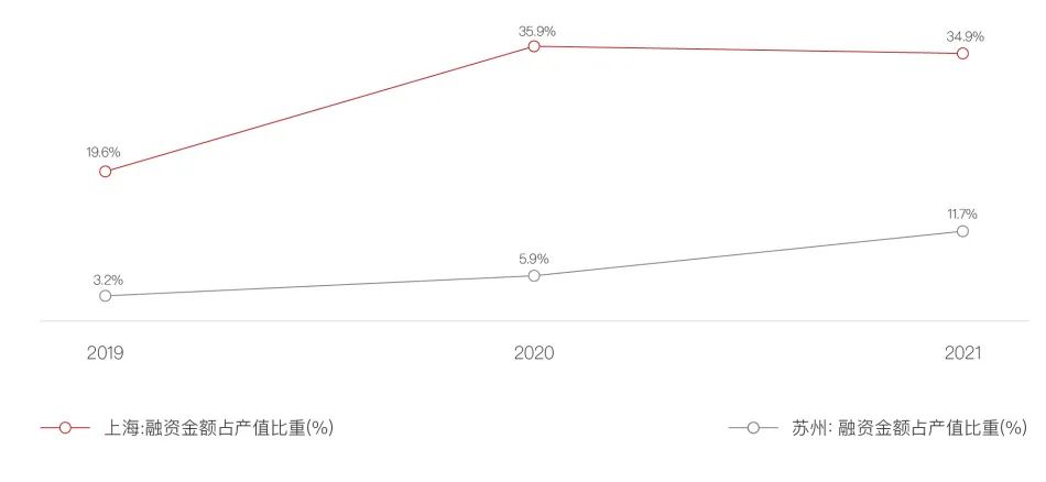 此外具体到单笔融资金额的数值和融资金额与城市产值的比值,上海明显高于苏州:即在相同产值下上海的企业更被认为能在未来创造出更高价值。可见相较之下,在产业发展前景方面苏州至少还是不如上海更为普遍受到资本认可。