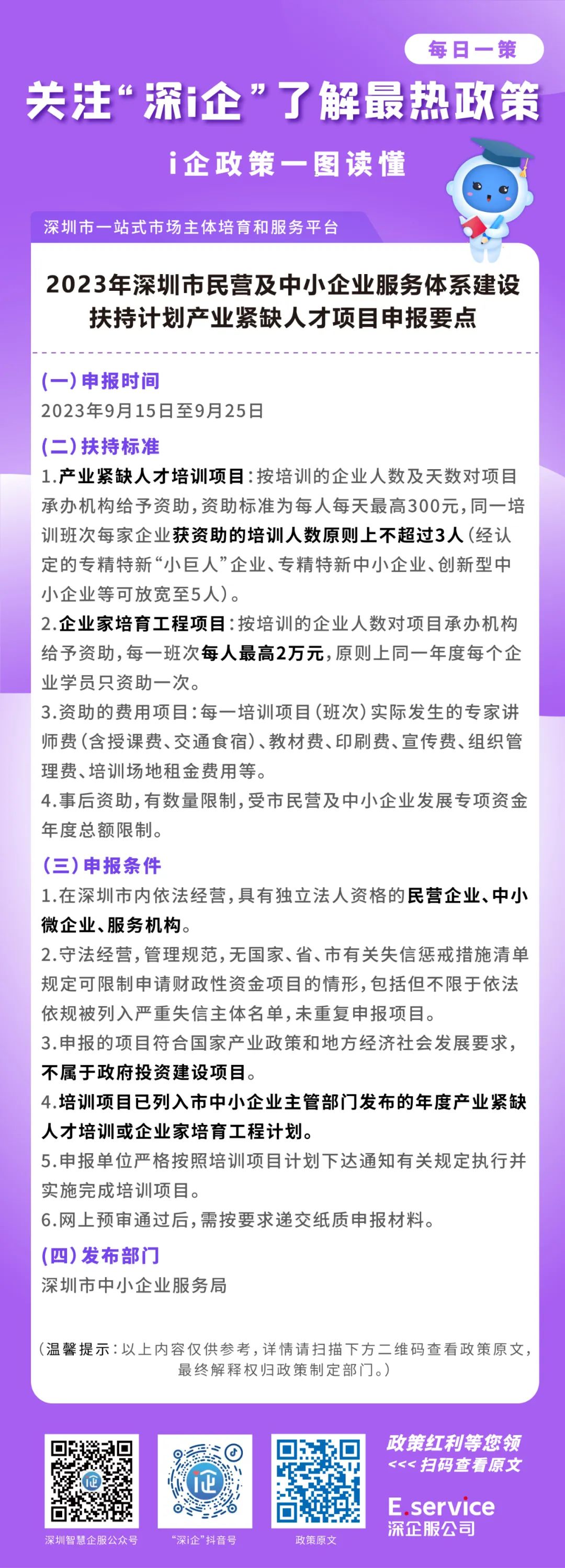 今天,“深i企”“每日一策”向您推荐:2023年深圳市民营及中小企业服务体系建设扶持计划产业紧缺人才项目申报要点。