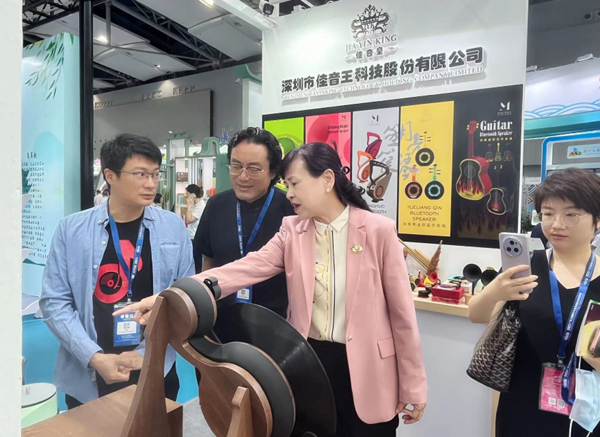 深圳市副市长,长时间停留我们展位,询问佳音王如何打造文化领域的产业链,内销产品经理王鹏颖给予介绍;并鼓励我们努力推广和传播文旅音乐产业文化。