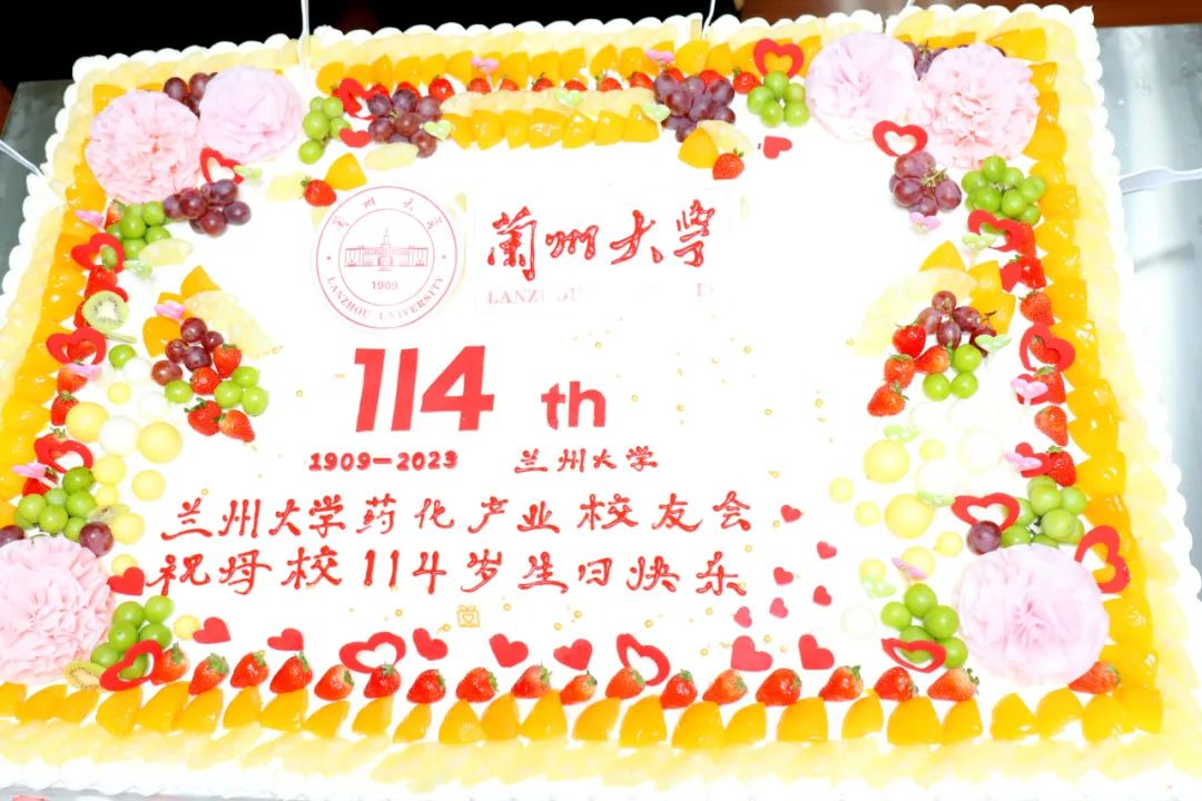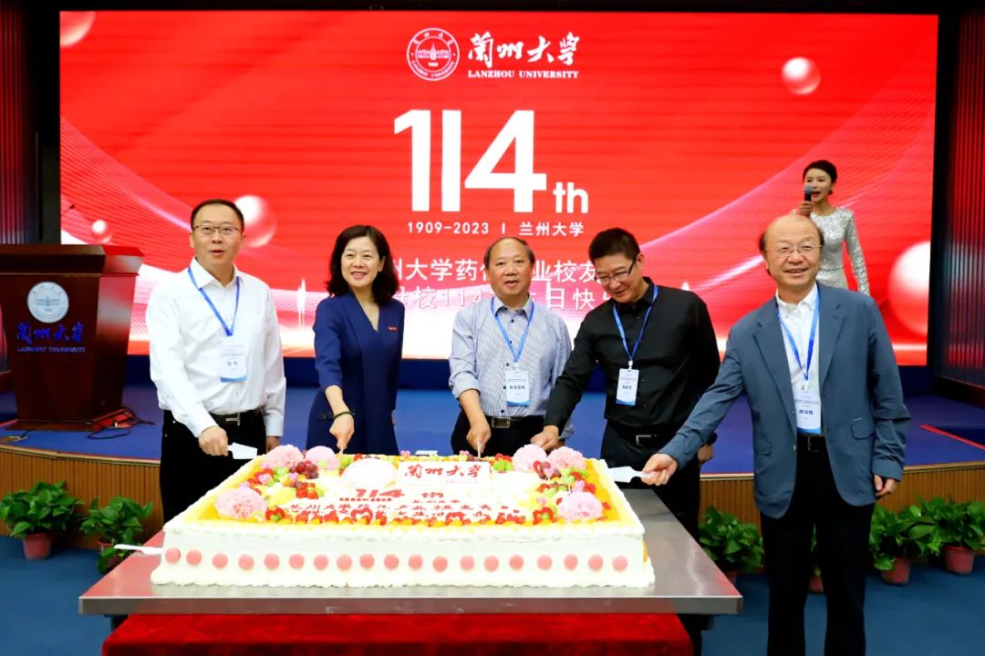 为庆祝母校兰州大学114岁生日,药化产业校友会特意定制庆祝蛋糕,涂永强、曹红、王为、陶新华、宋焱峰代表与会校友嘉宾上台分切蛋糕。