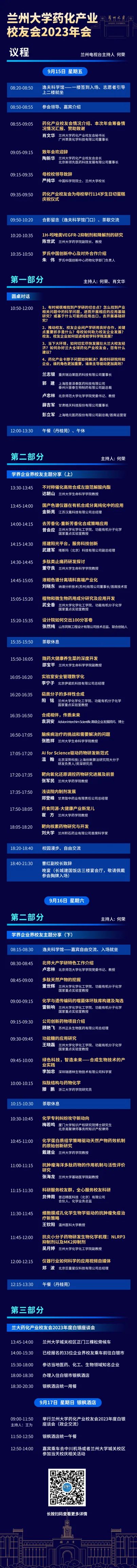9月15日,兰州大学药化产业校友会2023年年会暨药化产业企业家科学家校友论坛在兰州大学城关校区西区逸夫科学馆报告厅开幕。中国科学院院士、兰州大学校长严纯华,中国科学院院士、兰州大学化学化工学院教授涂永强,兰州大学副校长曹红出席大会。兰州大学科技经济文化促进会会长、1984级法学专业校友、兰州民城集团董事长尚峰,兰州大学药化产业校友会会长、1988级化学系校友、北京新领先医药科技发展有限公司董事长陶新华,兰州大学药化产业校友会秘书长、1994级化学系校友、化学加创始人、广州萃英化学科技有限公司董事长肖文华,兰州大学功能有机分子化学国家重点实验室、化学化工学院、生命科学学院、基础医学院、萃英学院、校友工作办公室等部门负责人,以及来自药化行业百余名校友,相聚兰大,共谋发展。
