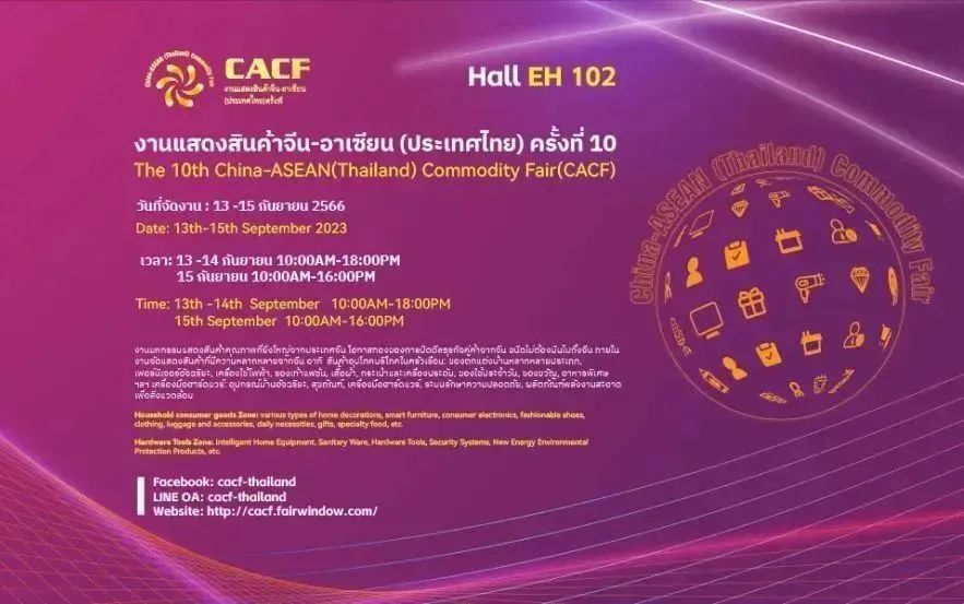 9月15日,由中国对外贸易中心集团有限公司主办,广东省商务厅、浙江省商务厅和宁波市商务局联合主办,中国对外贸易广州展览有限公司承办的第十届中国—东盟(泰国)商品贸易展览会(CACF)(以下简称泰国展)在泰国曼谷BITEC国际展览中心顺利闭幕。本届泰国展展出面积约6000平方米,共有来自广东、福建、浙江、江苏、贵州、山西、宁波等省市约200家企业参展,展出产品主要包括各类家居装饰品、消费日用电子、时尚鞋服箱包饰品等。展会同期举办贵州商品境外展(东盟站)、8场投资和开拓东盟及泰国市场的主题论坛以及多场线上直播活动。
