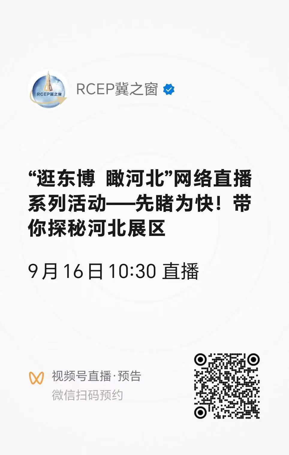 第20届中国-东盟博览会将于2023年9月16日至19日在广西南宁举办,河北代表团”逛东博 瞰河北“网络直播系列活动——先睹为快!带你探秘河北展区,将于9月16日(今天)上午10点半开启现场直播,快来扫码关注!!