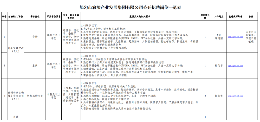 本次招聘共3个岗位,其中都匀市农旅集团财务管理中心招聘2人,下属公司贵州匀润咨询服务有限公司招聘2人,共计4人,具体详见《都匀市农旅产业发展集团有限公司公开招聘岗位一览表》(附件1)。