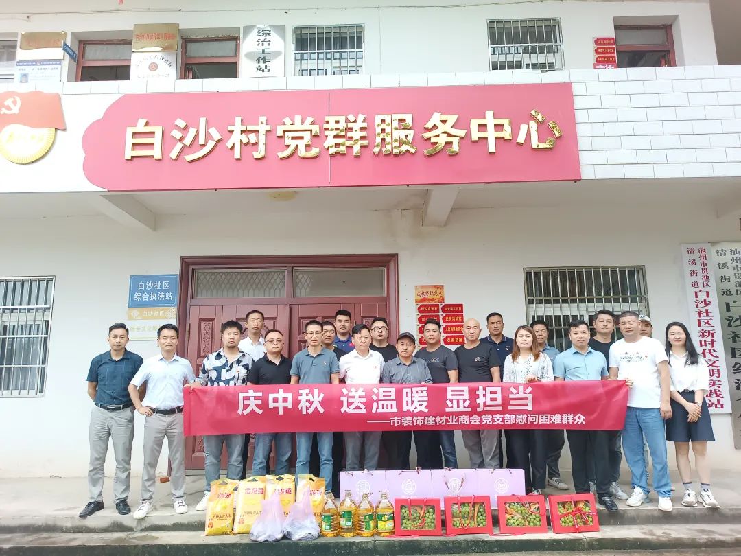 金秋送爽,丹桂飘香,在中秋佳节即将来临之际,为弘扬中华民族扶贫济困的传统美德,商会继续践行社会责任,9月15日上午,池州市装饰建材业商会党支部组织前往贵池区清溪街道白沙社区开展了“庆中秋 送温暖 显担当——慰问困难群众”主题党日活动,党支部书记毕张明带领全体党员、预备党员、发展对象和入党积极分子等共计20余人参加此次活动。