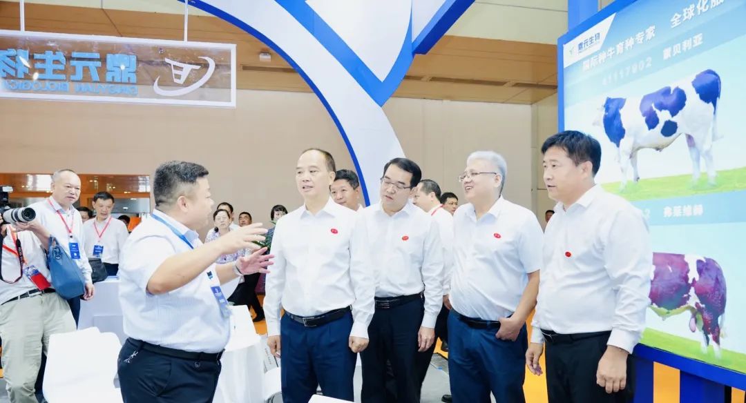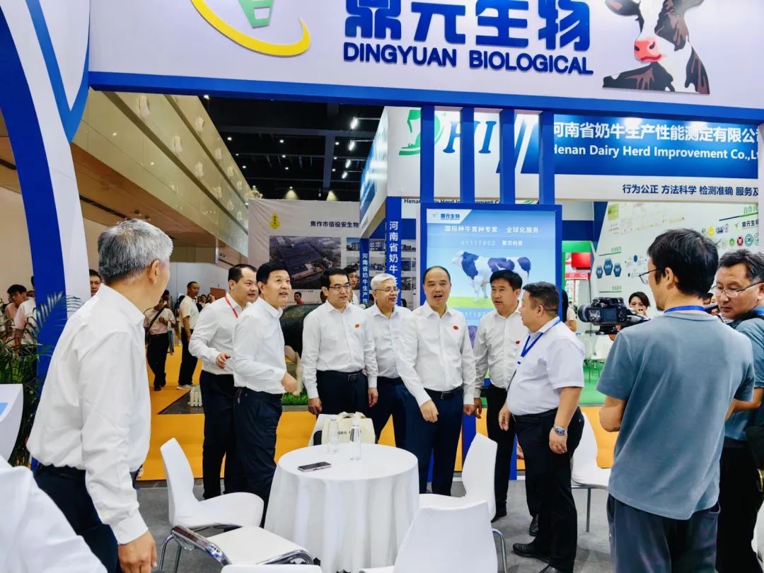 开幕式结束后,河南省人民政府副省长李酌等领导来到河南省鼎元种牛育种有限公司(以下简称鼎元公司)展位调研指导,鼎元公司董事长田全召陪同并向李酌副省长等领导介绍了鼎元公司的发展历程、目前发展现状和已取得的成果及未来展望。领导一行对鼎元公司目前取得的成绩表示肯定和祝贺,对鼎元公司接下来的发展提出了新的要求,鼎元公司要持续深耕育种行业,不断创新,为中原地区牛产业发展提供强有力的源头服务。