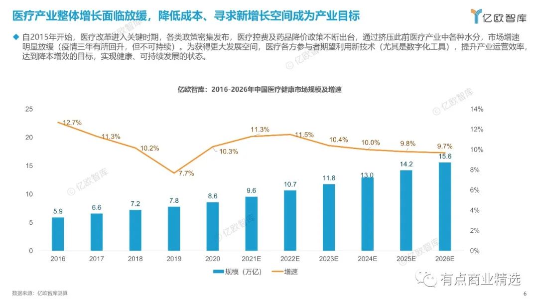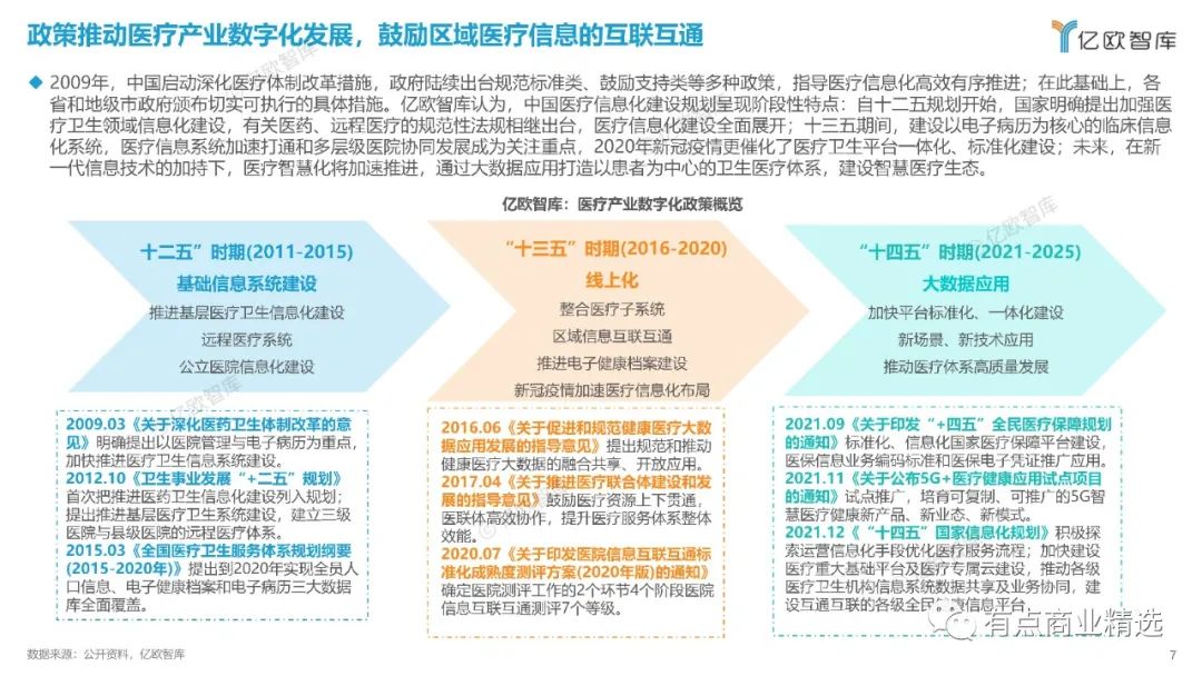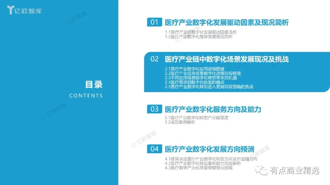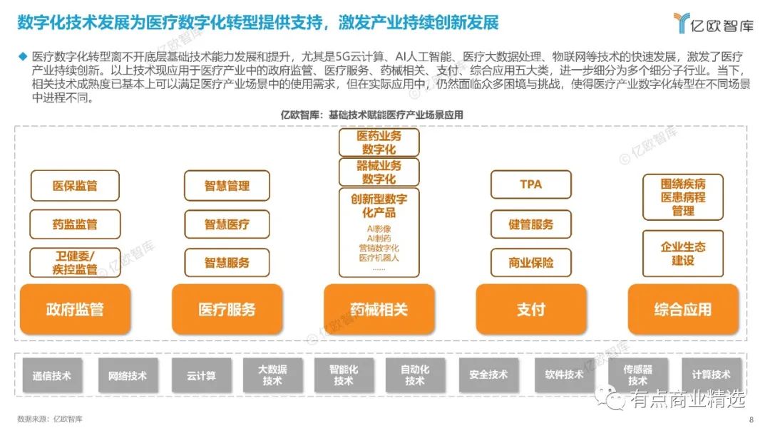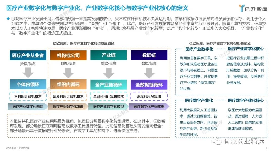 纵观医疗产业发展长河,信息和数据一直是其发展的核心,只不过在计算机技术欠发达时期,信息和数据以纸质形式给予展示和保存,调用于个人 经验之中,由单独个体来根据以往经验进行“查找”和“利用”;此时,医疗产业发展依靠众多经验丰富的行业领导者。随着计算机技术、信息技 术以及人工智能快速发展,医疗产业逐渐拥抱“变化”,涌现出多场景产业数字化转型;此时“数字化转型”正式步入大众视野,“产业数字化” 与“数字产业化”的概念正式提出。