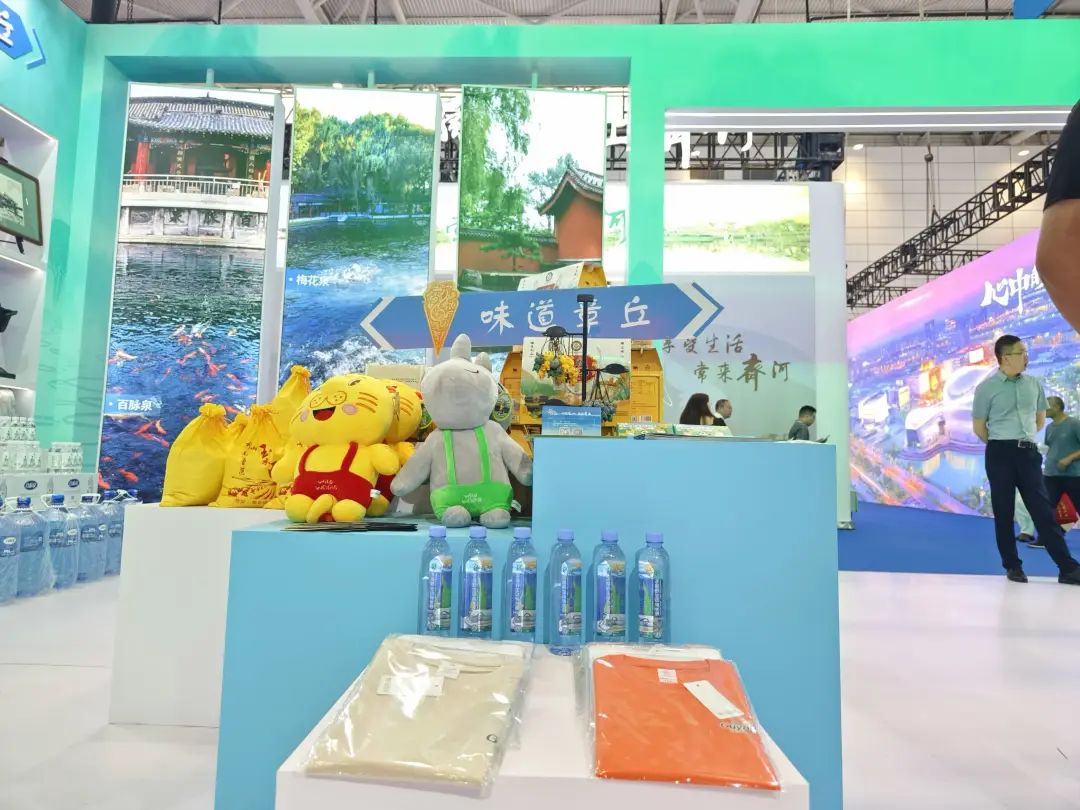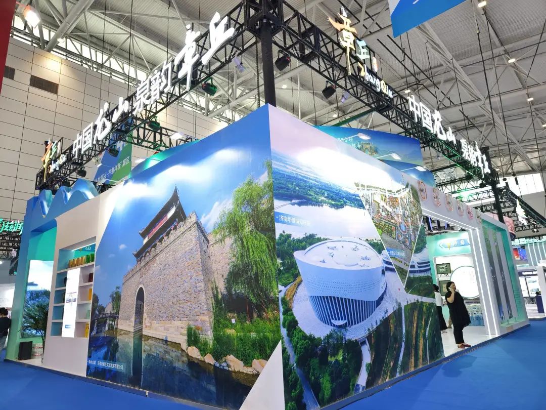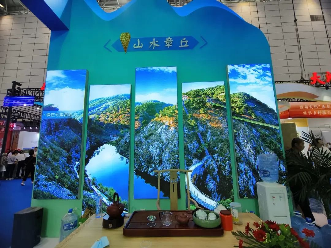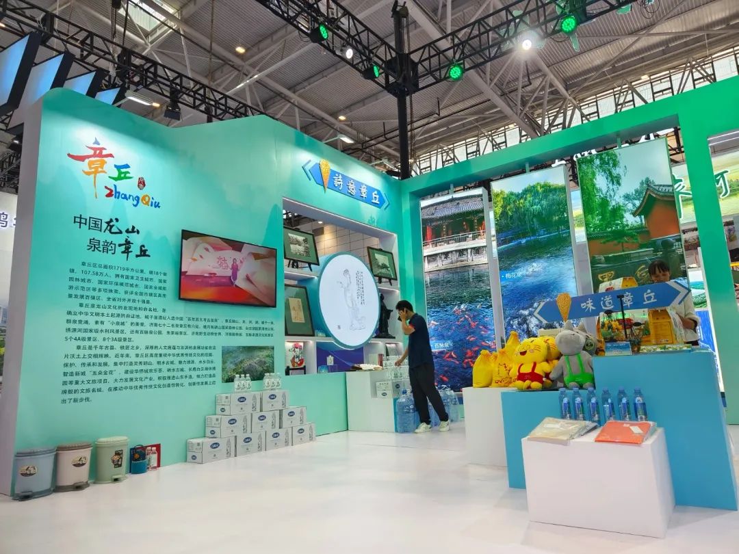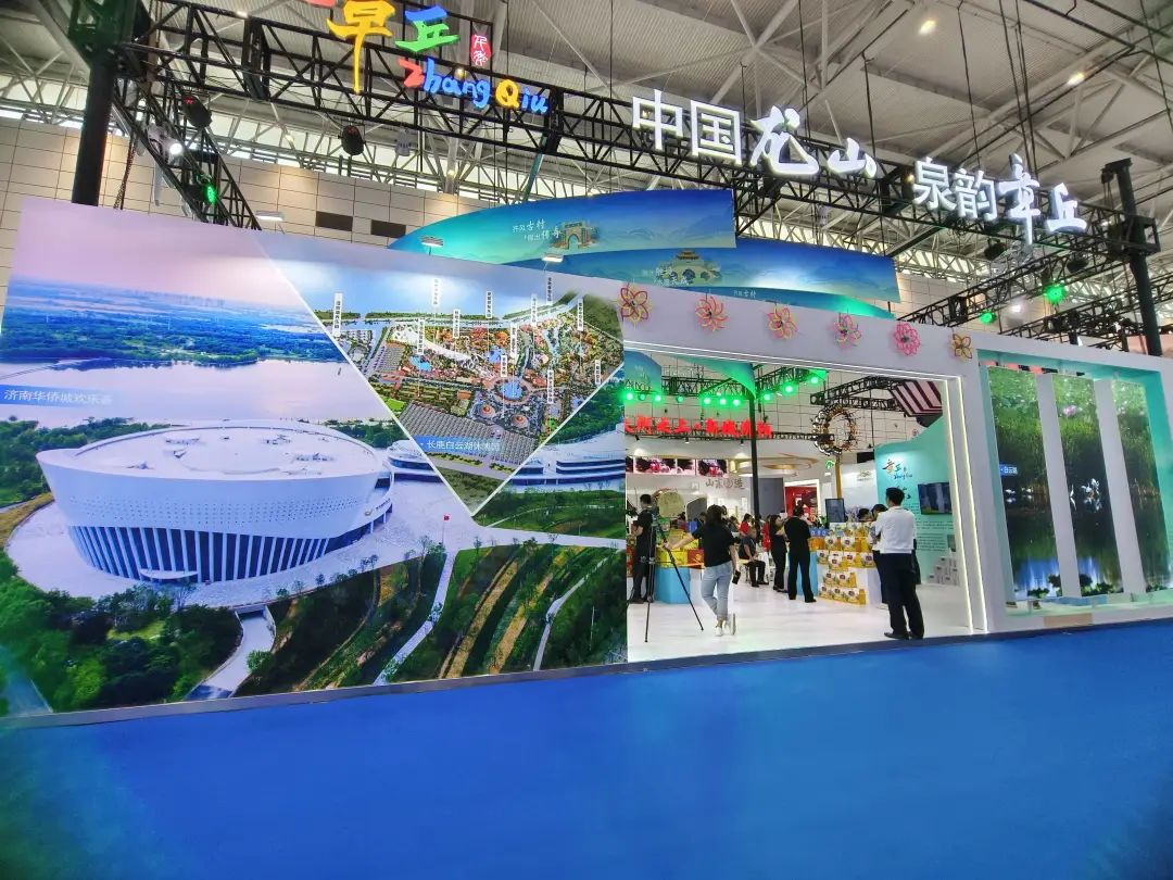 山水章丘和实力章丘板块,主要大屏展示《山河章丘》《章丘情》等城市区域品牌宣传片,图片展示章丘区生态空间结构、产业空间结构及明水古城、绣源河华侨城、长鹿白云湖休博园等重大文旅项目,实物展示百脉泉酒等文创产品,展现章丘文旅产业发展的蓬勃生机、文旅名城打造的生动实践和山水灵动的壮丽画卷。