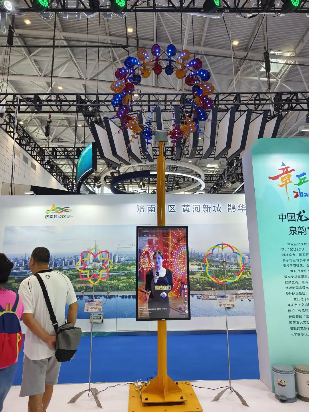 在章丘展区的入口处,首先让人眼前一亮的就是大型风动雕塑,它高4.5米,风动状态下犹如在风中绽放的花朵。夜晚亮灯后,更加缤纷耀眼,充满动感。在内部布局上,本展区设置了五个板块,运用特色纷呈的手造、形式多样的互动、丰富多彩的影音等形式,充分展示章丘打造文旅名城的新实践。