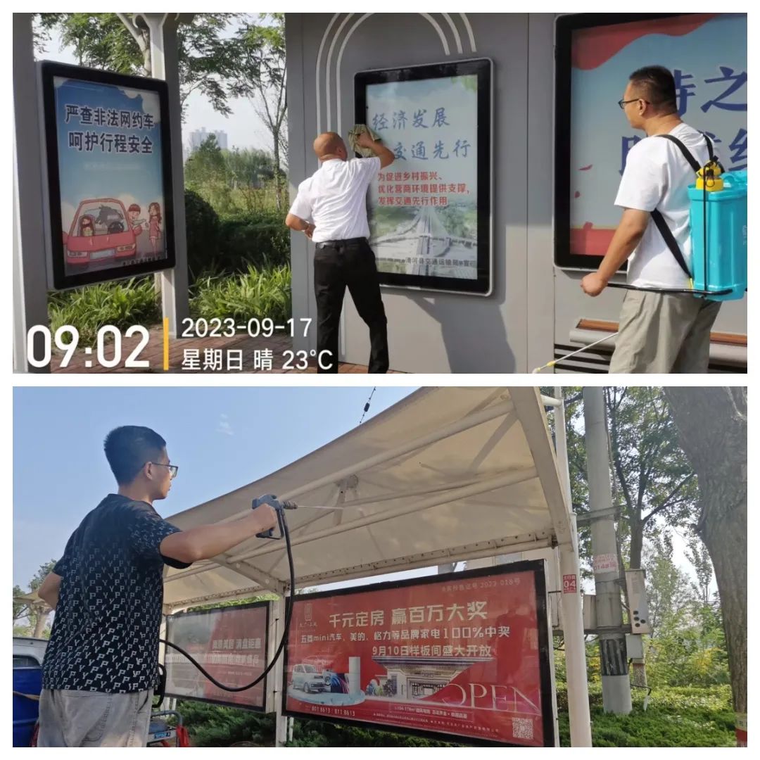 对太行路、渤海路以及青阳广场和火车站等18处智慧公交电子站牌和停车站点进行清扫清洁,并对公交站牌及周边区域的小广告、烟头等进行清理,使其焕然一新,提升城市形象;同时对
