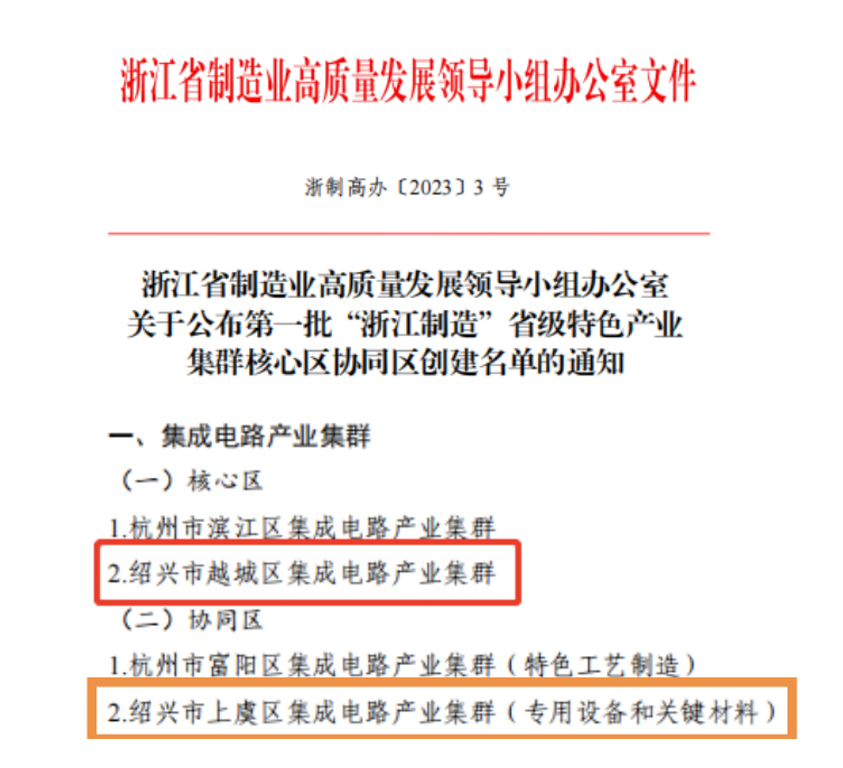 2023年2月10日,越城区集成电路产业集群、上虞区集成电路装备及材料产业集群分别入选首批“浙江制造”特色产业集群核心区、协同区创建名单