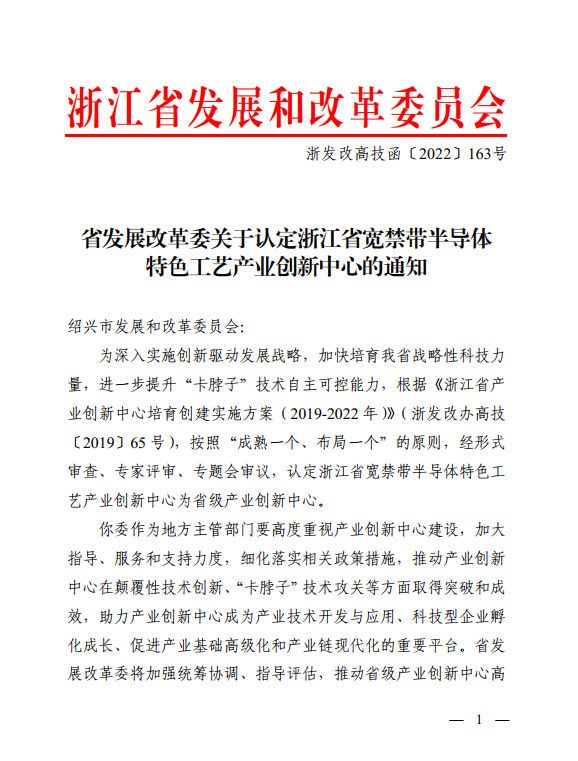 2022年3月28日,绍兴集成电路产业创新中心(浙江省宽禁带半导体特色工艺产业创新中心)正式获批
