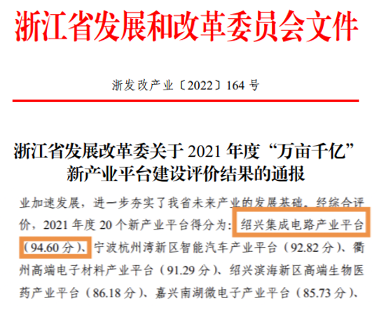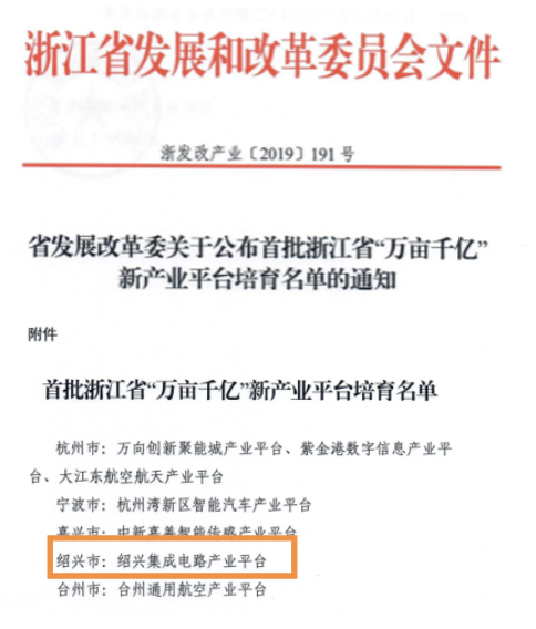 2019年4月,绍兴集成电路产业平台成功入选浙江省首批“万亩千亿”新产业平台培育名单