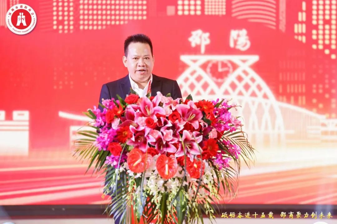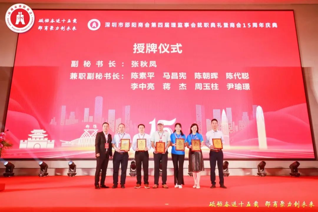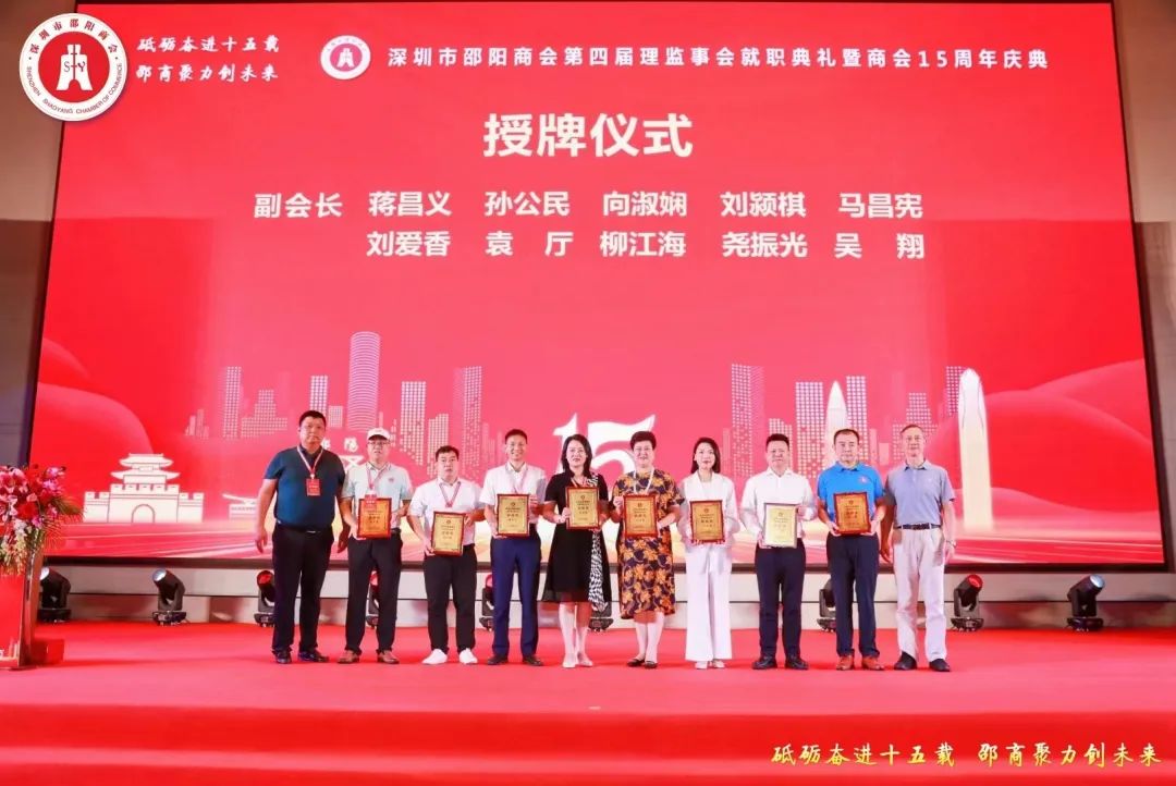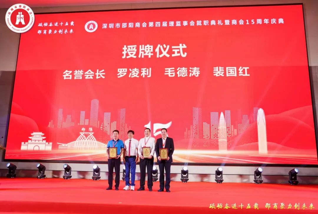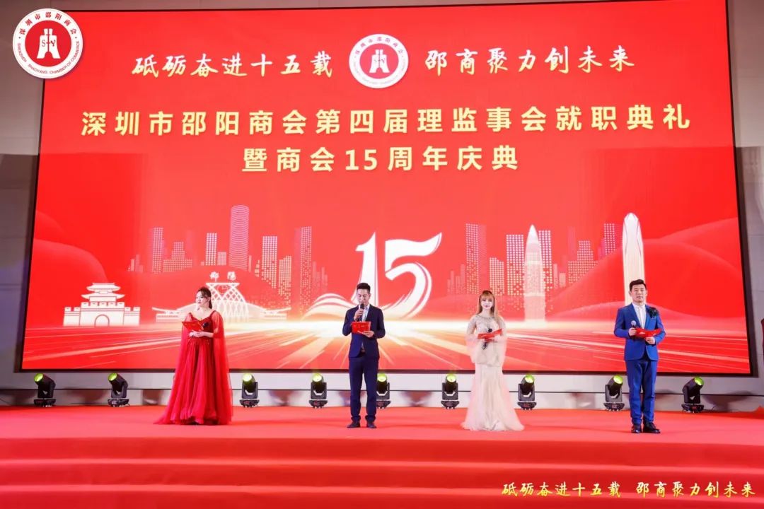 砥砺奋进十五载、邵商聚力创未来!深圳市邵阳商会第三届会长张红学,以及第四届当选会长刘世梁、执行会长张邵军、监事长曾常青率领第四届商会班子成员、理事会、监事会、会员及嘉宾600余人参加庆典。出席本次大会的嘉宾有深圳大学校长毛军发、原邵阳市委书记黄天锡、原深圳市委常委警备区政委曹绍业、湖南省驻深圳办事处副主任李永东、邵阳市政府副秘书长李荣卫、原湘潭市委常委陈云龙、湖南省驻深圳办事处李志远处长、原深圳市接待处处长李忠平、上海交通大学深圳研究院院长刘河洲、中华邵商联合会秘书长卿前平、深圳市湖南商会会长梁白苹、福建省湖南邵阳商会会长蒋太柏、郑州市邵阳商会会长陈贵雄、广东省湖南邵阳商会会长颜盛繁、肇庆市邵阳商会会长李海田、珠海市邵阳商会会长刘云德、惠州市邵阳商会会长谢清水、邵阳学院深圳校友会会长万祖军、江门市邵阳商会执行会长潘显军、珠海市邵阳商会创会会长曾小津等共同见证商会迈向新征程。