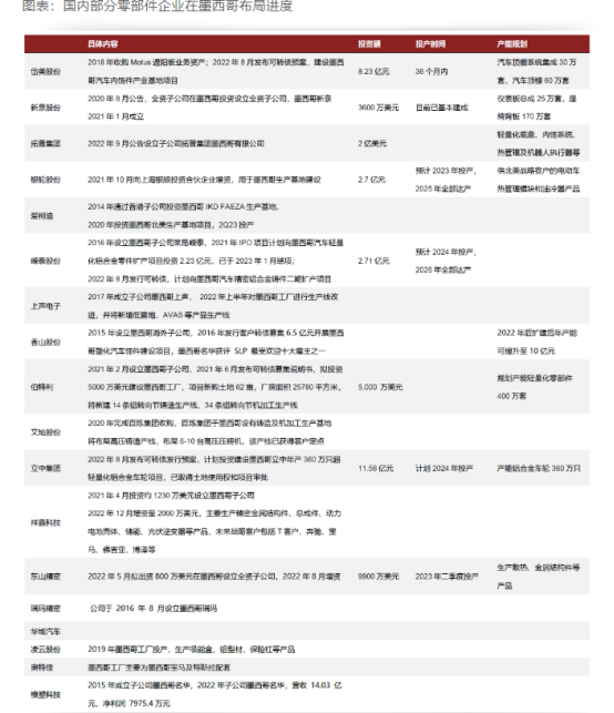 2023年3月,特斯拉宣布在墨西哥蒙特雷郊区建设“全球最大电动汽车工厂”,并表示最快于明年投产。中国零部件公司跟随特斯拉加速墨西哥工厂布局,其中爱柯迪、嵘泰股份、新泉股份、敏实集团、万丰奥威、均胜电子、文灿股份等公司已在墨西哥量产,旭升集团、拓普集团围绕特斯拉墨西哥工厂加速产能布局,有望在全球范围内实现中国零部件配套。