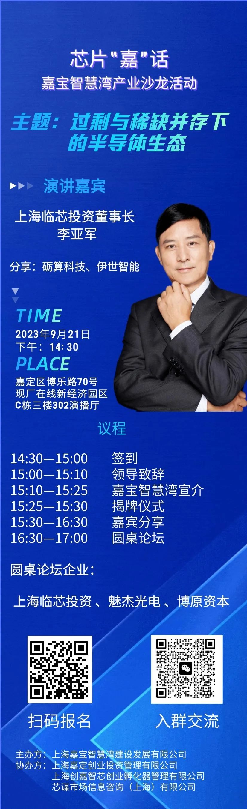 本期活动成功邀请到上海临芯投资管理有限公司董事长李亚军,他将以“过剩与稀缺并存下的半导体生态”为主题进行精彩演讲(具体议程见下方海报)。