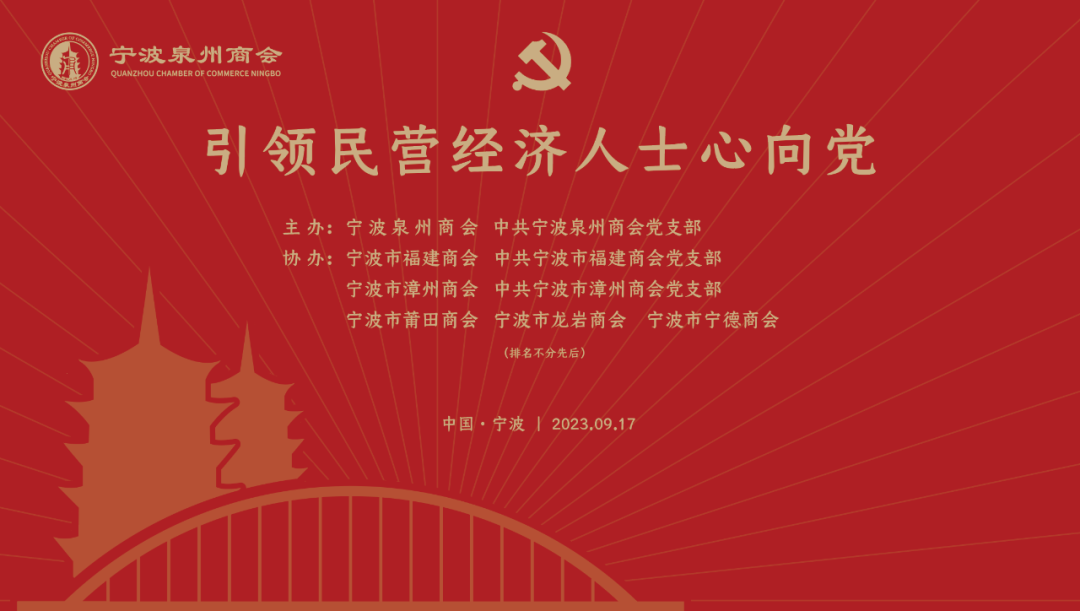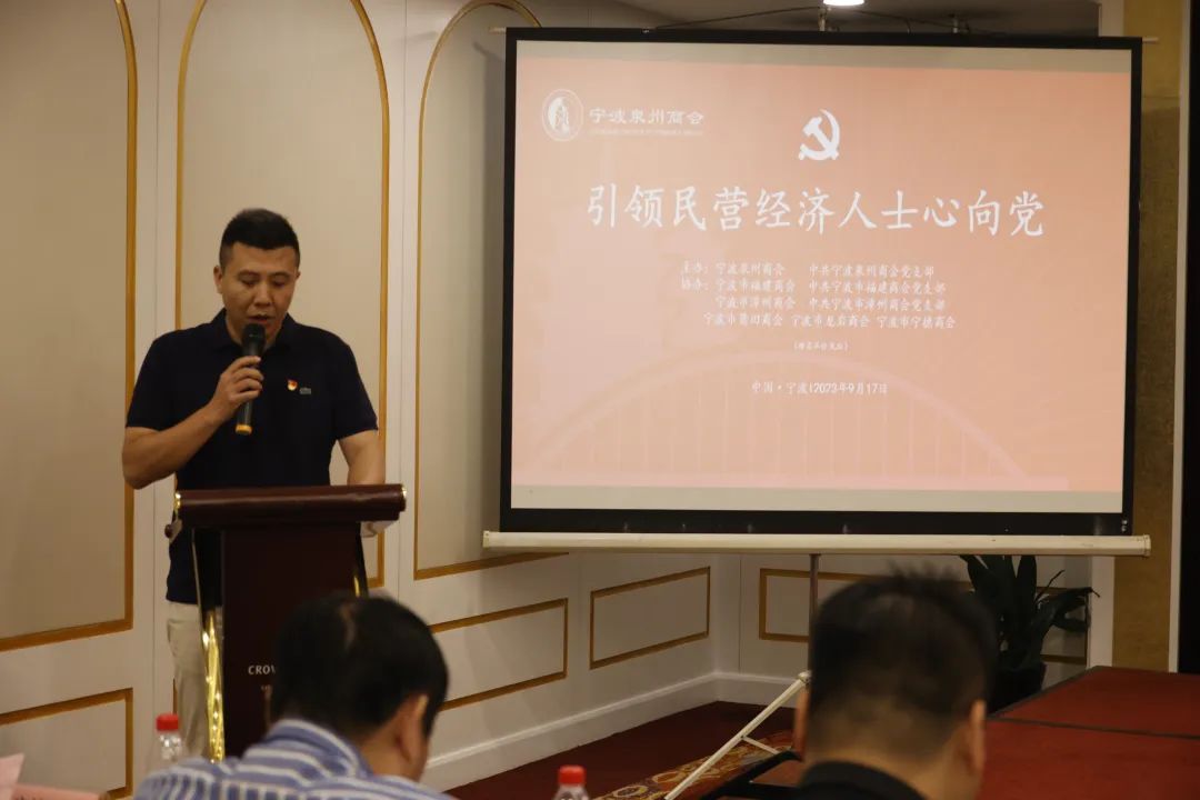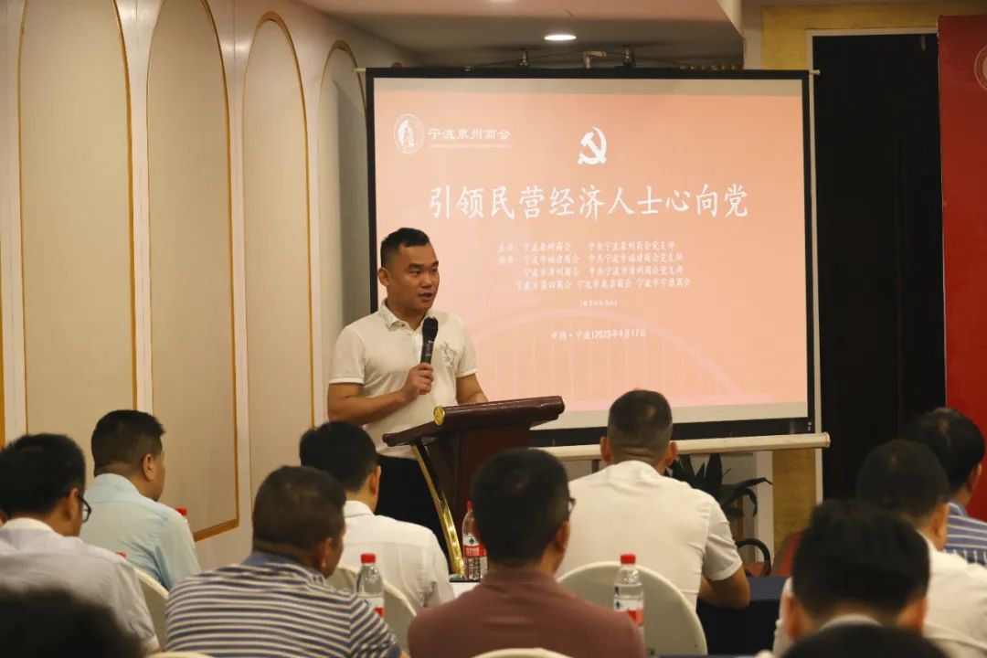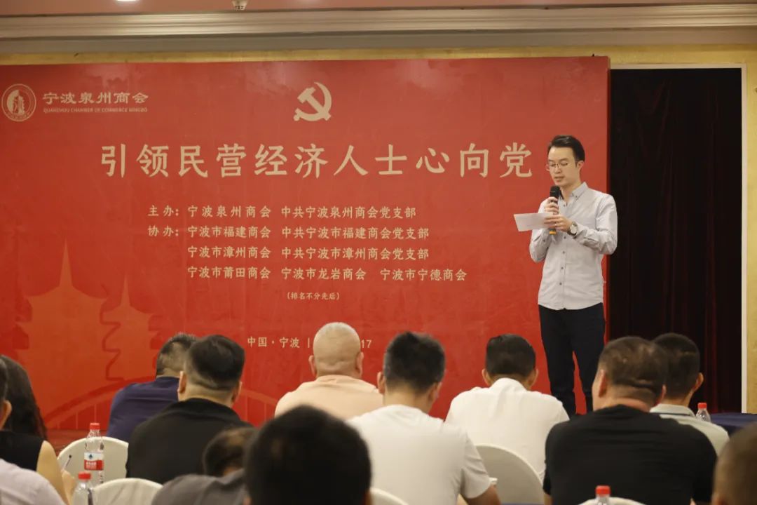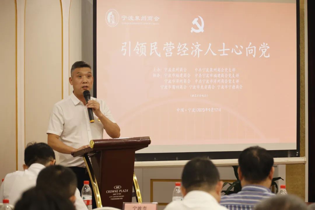9月17日下午,由宁波泉州商会和宁波泉州商会党支部主办,宁波市福建商会和宁波市福建商会党支部,宁波市漳州商会和宁波市漳州商会党支部,宁波市龙岩商会、宁波市莆田商会、宁波市宁德商会协办的“引领民营经济人士心向党”专项活动在凯洲皇冠假日大酒店举办,来自宁波泉州商会等六个商会的会长班子、兄弟商会党支部支委班子及党员、各商会党外会员企业负责人近百人参加了专项活动。宁波大学法学院副院长、法学博士、博士后何跃军教授为大家做题为《党建引领民营经济高质量发展》的专题讲座。活动由宁波泉州商会执行秘书长崔振锋主持。