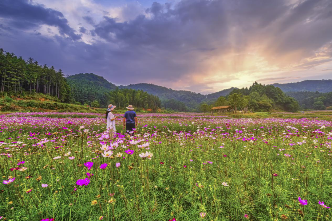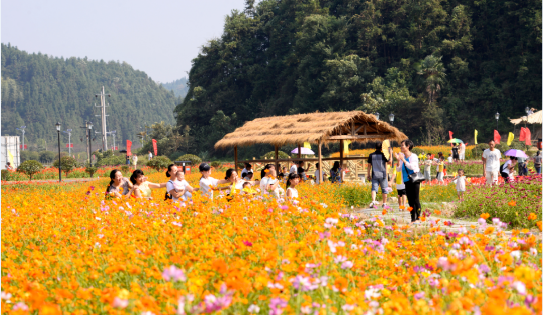 发展乡村休闲旅游游,打造百亩格桑花海,游客在花海拍照打卡