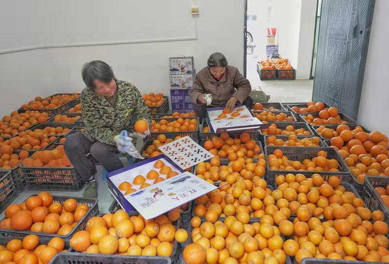 果冻橙迎来大丰收,村民在基地进行果冻橙产品包装