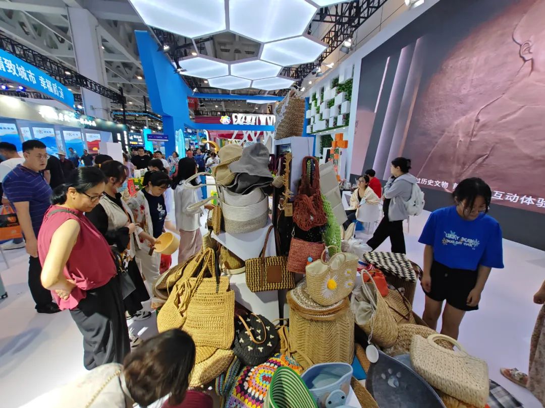在烟台展位,由莱州市利富工艺品带来的国家级非物质文化遗产——莱州草编工艺品销售火热,观众挑选着款式多样的草编包、帽子、家居收纳筐等,不时还有观众前来咨询昨天预定好的款式。据工作人员介绍,展会期间销售额大大超出预期,公司产品不仅在国内深受欢迎,还畅销欧美、东南亚、日本等几十个国家及地区。
