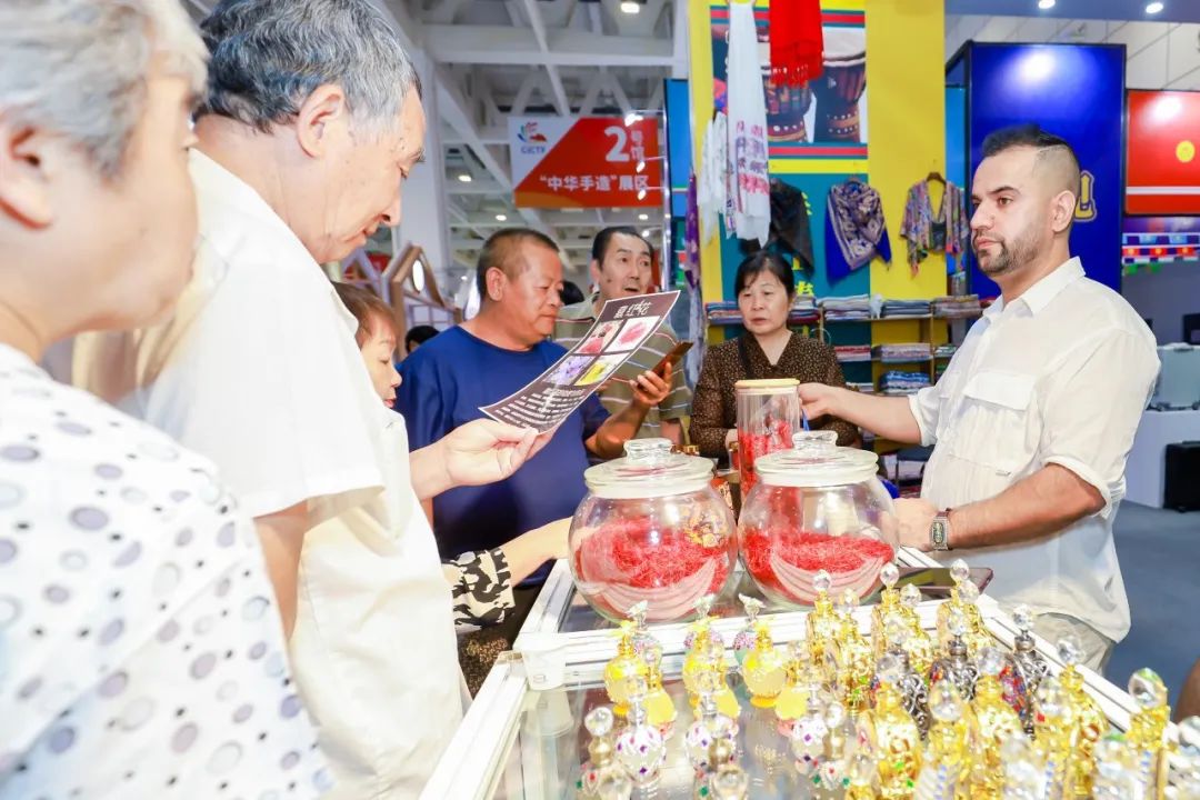 在“千帆竞海”展区,来自多个国家和地区的展商展位被前来采购的市民团团围住。伊朗的手工毛毯、加纳的手鼓、捷克的水晶、马里的木雕及皮雕工艺品、巴基斯坦的玉器……各式各样的展品,吸引着观众不断涌入展位咨询了解。