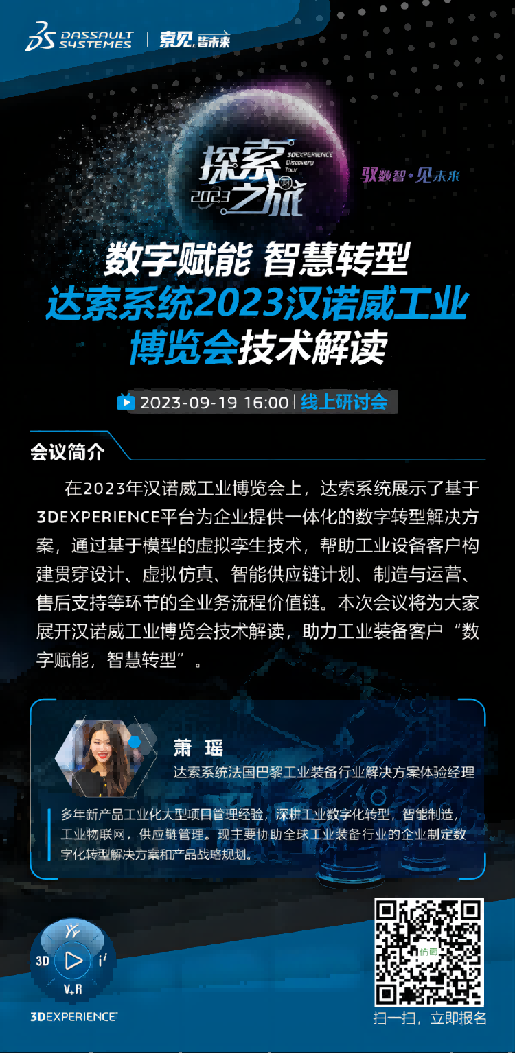 9月19日16时,达索系统官方将在仿真秀官网和APP同步直播《 2023汉诺威工业博览会技术解》欢迎大家报名。