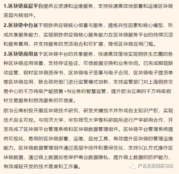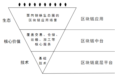 欧冶云商区块链服务平台包括三个层次:区块链底层平台、区块链中台和区块链应用。