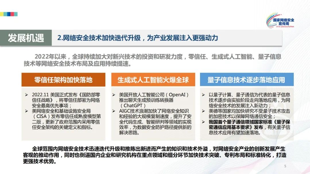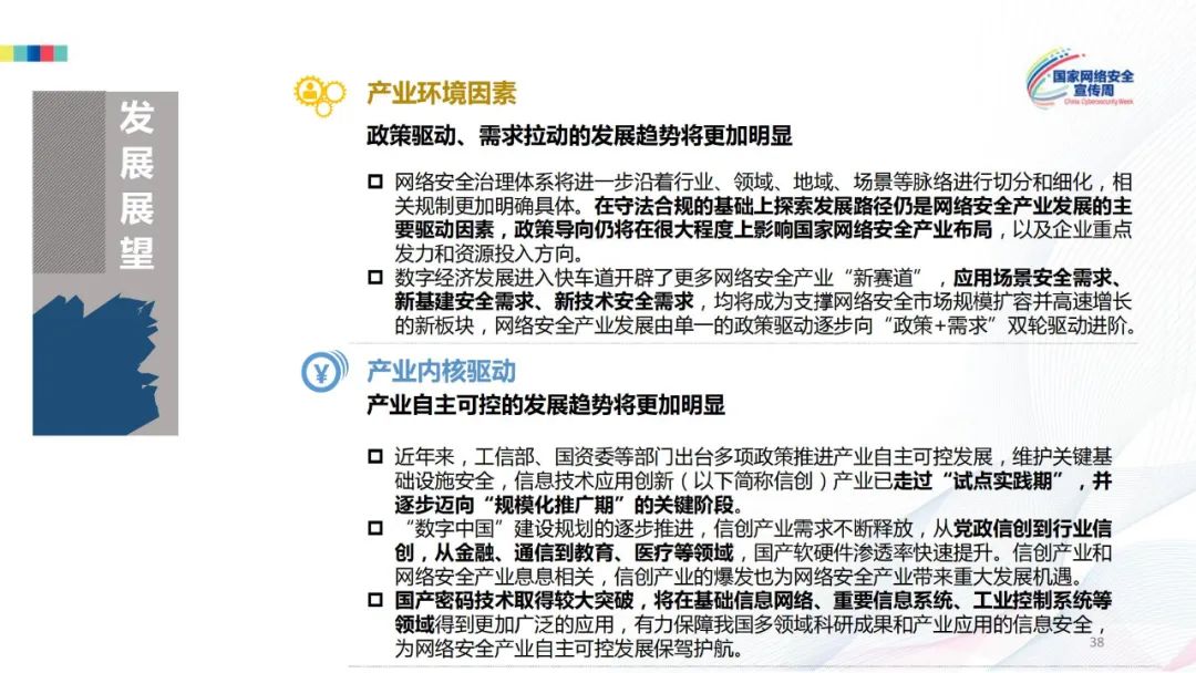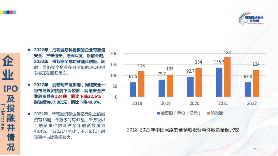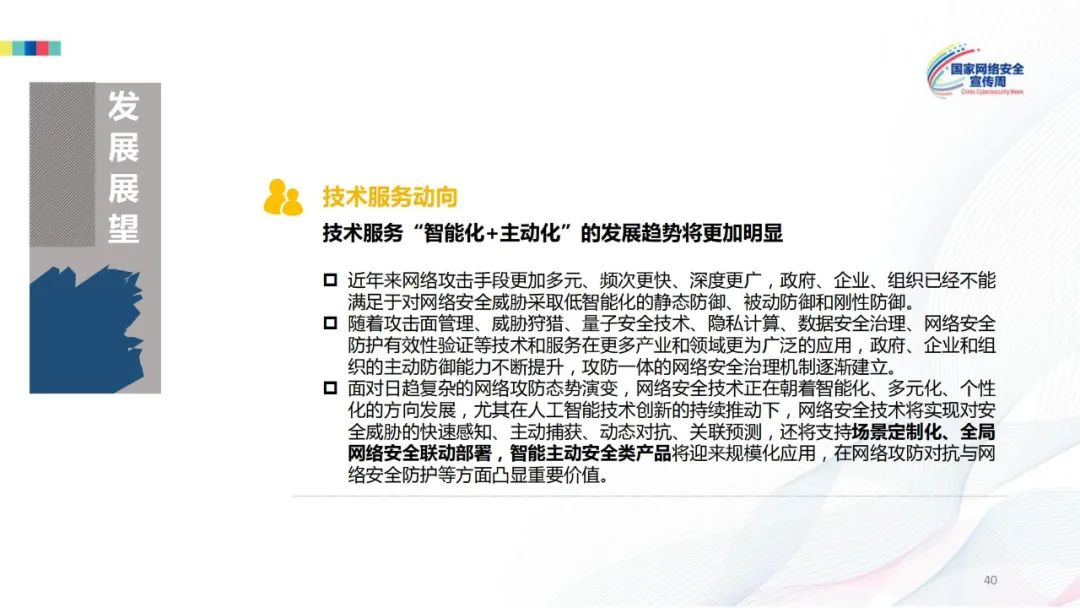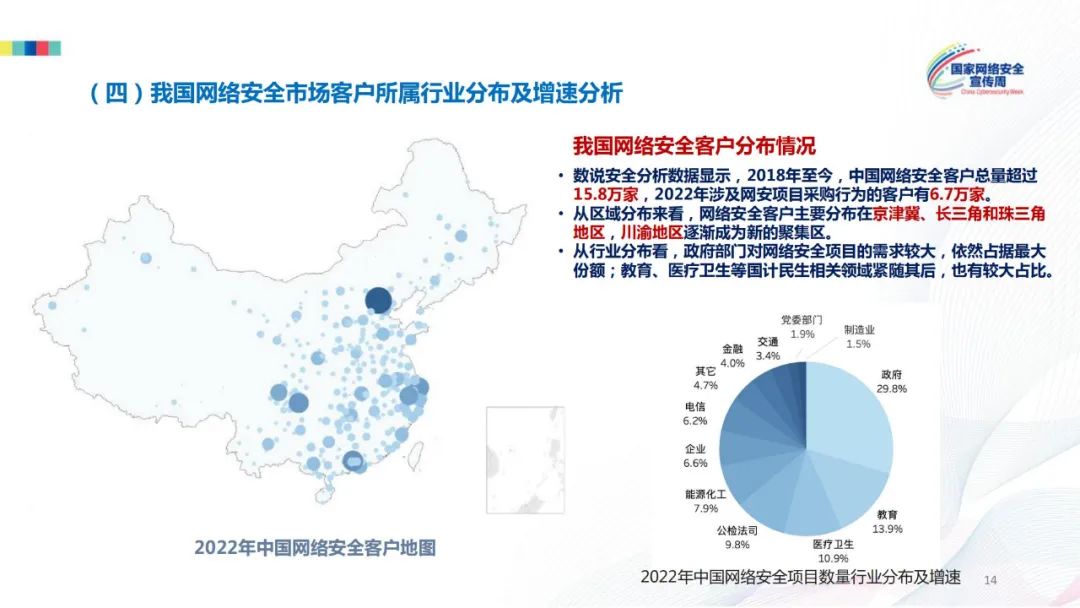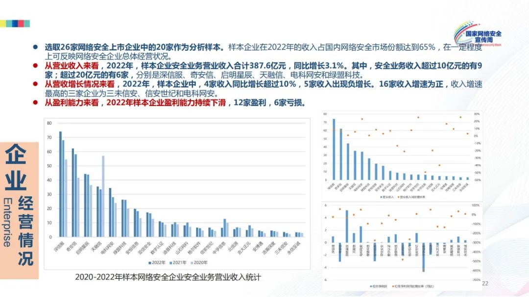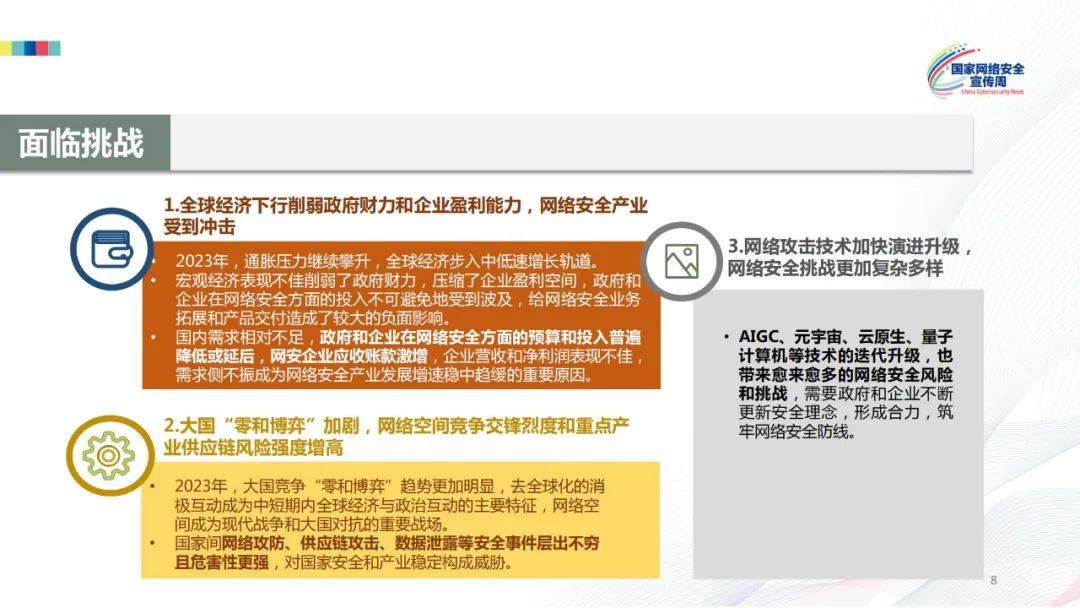 2022年,我国网络安全市场规模约为633亿元,同比增长3.1%,增长态势延续,增长率稳中趋缓。随着疫情平稳转段、网络安全相关政策法规和标准规范相继落地、网络安全治理日臻完善、网络安全技术加快迭代升级等正向激励效能显现,网络安全企业数量有所增长,网络安全市场需求持续扩大。预计未来三年产业增速将保持在10%以上,到2025年市场规模预计将超过800亿元。 当前,全球经济进入下行通道,政府财力和企业利润空间进一步压缩,导致其对网络安全投入减少,网络安全市场需求萎靡,这削弱了网络安全企业盈利能力。国内主要网络安全企业迎难而上,以积极心态迎接市场挑战,不断加大研发和销售投入,新技术、新应用、新业务不断涌现。同时,数字经济发展进入快车道,开辟了更多网络安全产业“新赛道”,应用场景安全需求、新基建安全需求、新技术安全需求释放,为网络安全产业加速发展注入了新动力。 国内对网络安全的重视程度、项目投入和客户分布呈现出一致性,经济发展状况与网络安全市场分布具有高度相关性。华北、华东和华南仍是网络安全投入高、客户分布相对集中的区域。2022年,网络安全企业在以上三个区域的合计收入占比达到71%。同时,网络安全企业积极响应共建“一带一路”倡议,加快探索海外市场。领军企业海外业务发展良好,创新型企业积极尝试突破,并取得一定成绩,海外市场占比小幅提升,预计未来海外市场将成为我国网络安全企业新的业务增长点。 2022年以来,三未信安、亚信安全、浩瀚深度、永信至诚、盛邦安全相继登录科创板。2022年,网络安全行业投融并事件共有124起,融资额为67.8亿元,同比有所回落。投资机构对于成长期和中后期网络安全项目的投资更趋谨慎,早期项目获投数量增长较快。随着注册制改革加速及北交所开市,网络安全投资退出通道进一步丰富,将对网络安全投资产生正向激励。 2023年,网络安全产业涌现10个发展热点,分别是生成式人工智能、人工智能对抗攻防技术、量子安全技术、云原生安全、网络安全保险服务、安全审计和合规性服务、网络安全防护有效性验证服务、云密码服务、数据安全治理,以及软件供应链安全治理。 网络安全产业服务化发展趋势更加凸显。2023年上半年,服务型企业数量同比增长32.5%,成为网络安全市场扩容的主要力量。行业领军企业正在向“产品 服务”综合解决方案提供商转变,用户企业愈发看重网络安全服务的有效性、持续性和体系化,网络安全运营、安全审计和合规性服务、云密码服务等网络安全服务的重要性更加凸显。