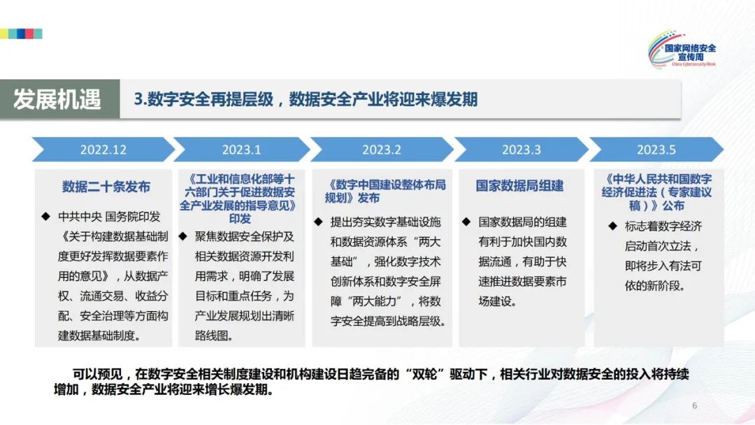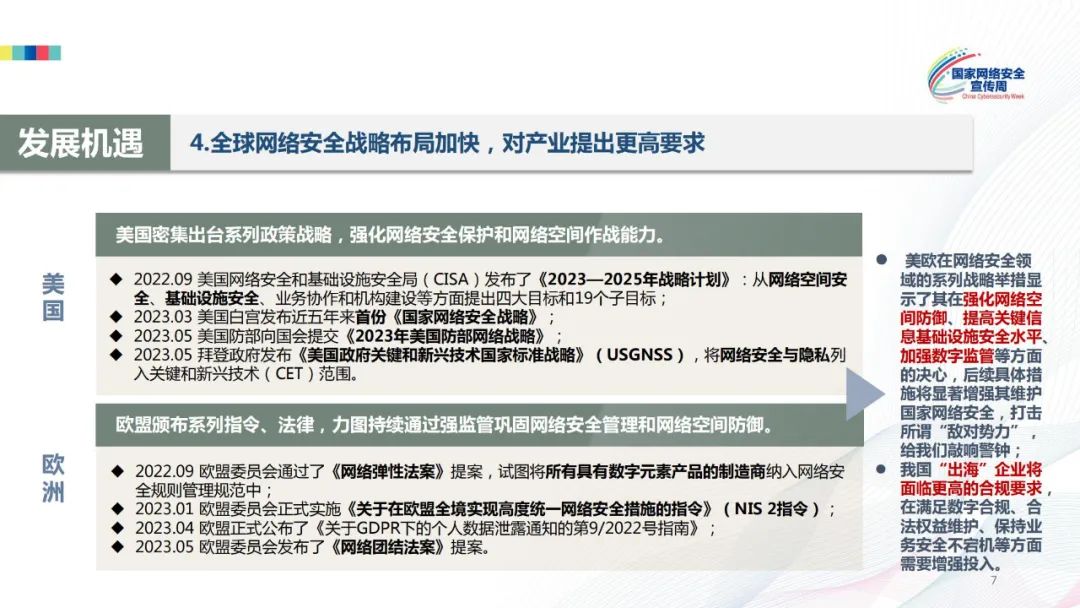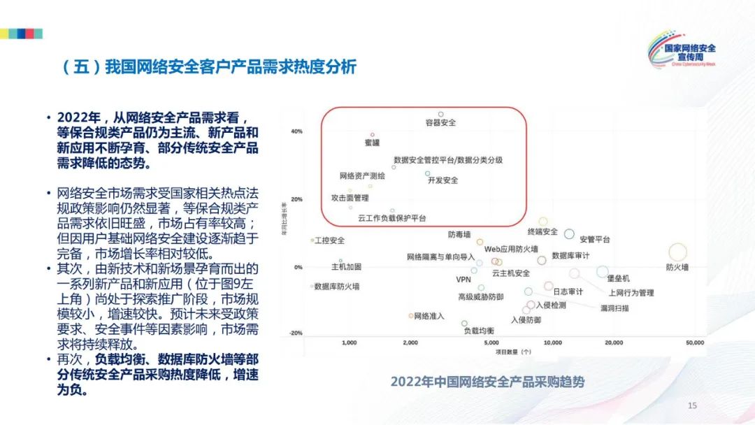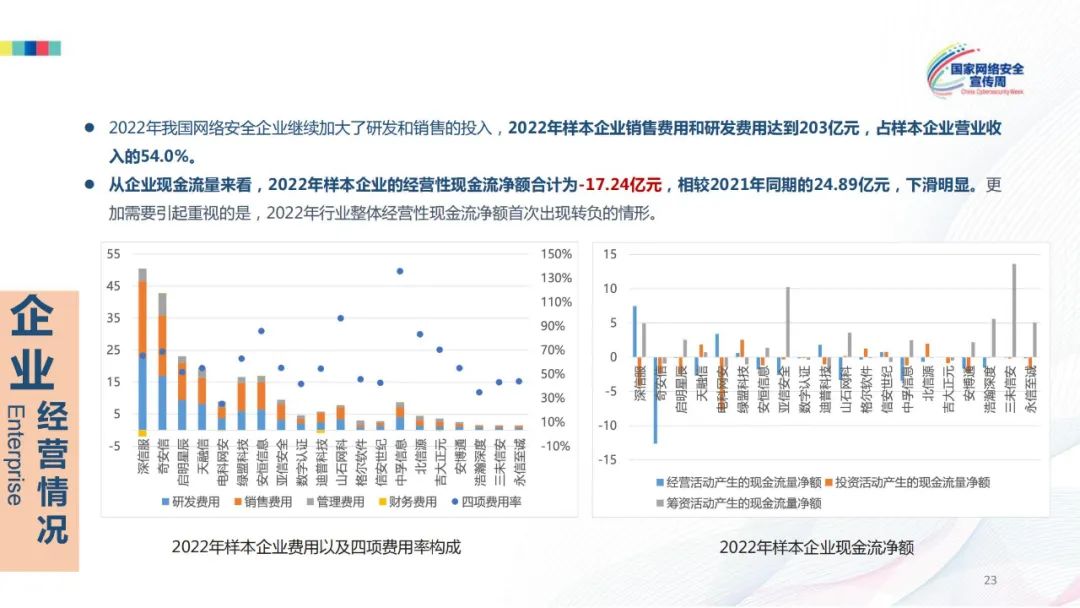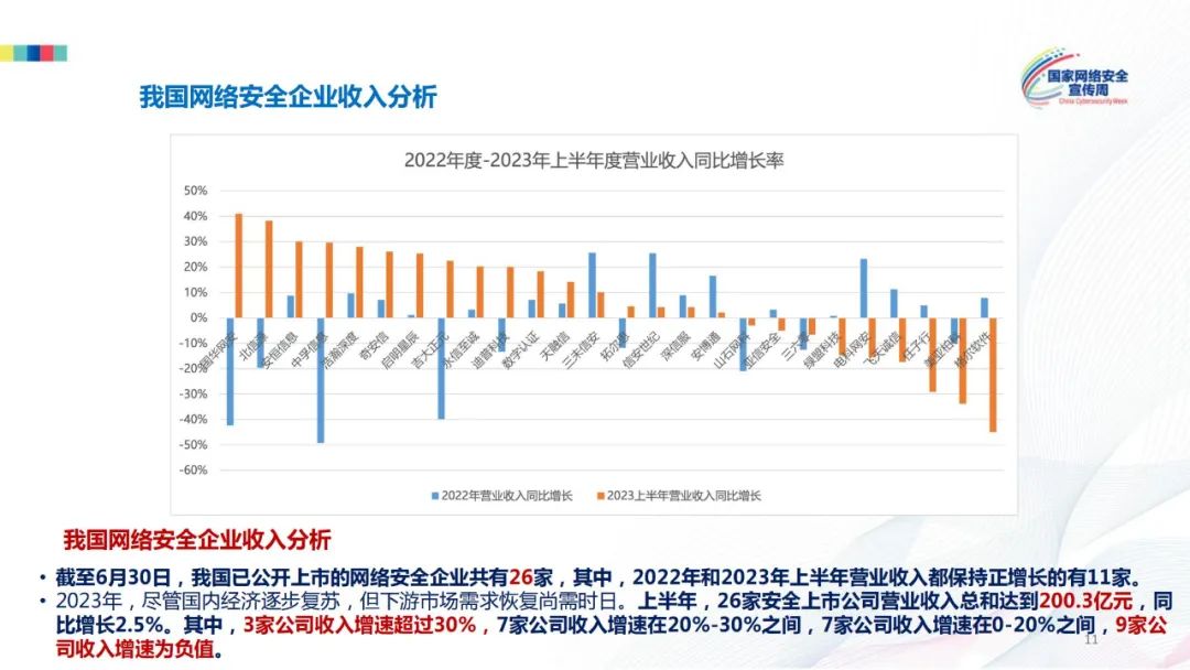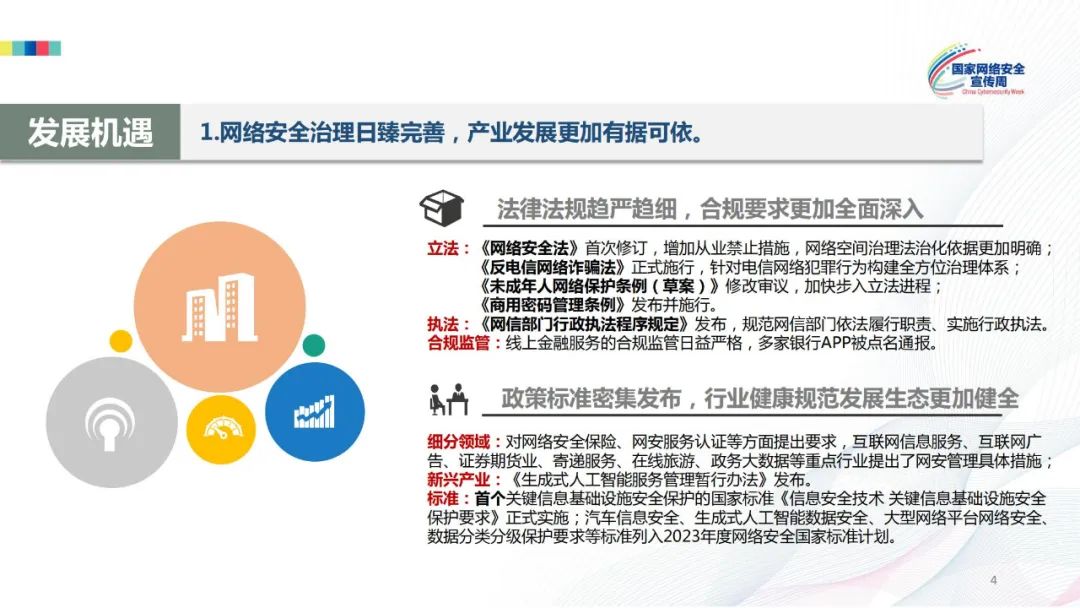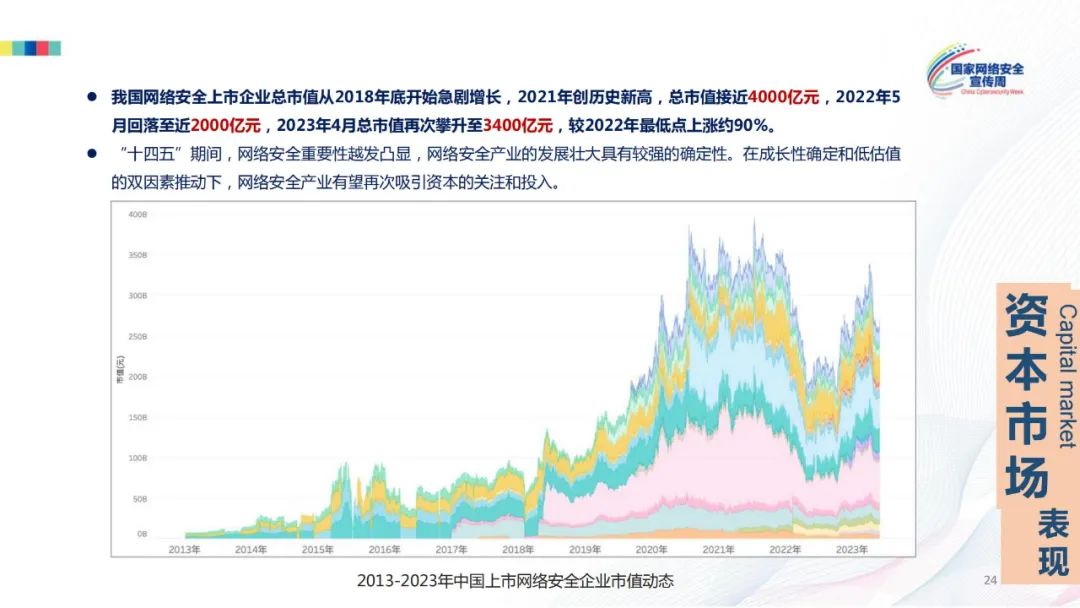 2022年,我国网络安全市场规模约为633亿元,同比增长3.1%,增长态势延续,增长率稳中趋缓。随着疫情平稳转段、网络安全相关政策法规和标准规范相继落地、网络安全治理日臻完善、网络安全技术加快迭代升级等正向激励效能显现,网络安全企业数量有所增长,网络安全市场需求持续扩大。预计未来三年产业增速将保持在10%以上,到2025年市场规模预计将超过800亿元。 当前,全球经济进入下行通道,政府财力和企业利润空间进一步压缩,导致其对网络安全投入减少,网络安全市场需求萎靡,这削弱了网络安全企业盈利能力。国内主要网络安全企业迎难而上,以积极心态迎接市场挑战,不断加大研发和销售投入,新技术、新应用、新业务不断涌现。同时,数字经济发展进入快车道,开辟了更多网络安全产业“新赛道”,应用场景安全需求、新基建安全需求、新技术安全需求释放,为网络安全产业加速发展注入了新动力。 国内对网络安全的重视程度、项目投入和客户分布呈现出一致性,经济发展状况与网络安全市场分布具有高度相关性。华北、华东和华南仍是网络安全投入高、客户分布相对集中的区域。2022年,网络安全企业在以上三个区域的合计收入占比达到71%。同时,网络安全企业积极响应共建“一带一路”倡议,加快探索海外市场。领军企业海外业务发展良好,创新型企业积极尝试突破,并取得一定成绩,海外市场占比小幅提升,预计未来海外市场将成为我国网络安全企业新的业务增长点。 2022年以来,三未信安、亚信安全、浩瀚深度、永信至诚、盛邦安全相继登录科创板。2022年,网络安全行业投融并事件共有124起,融资额为67.8亿元,同比有所回落。投资机构对于成长期和中后期网络安全项目的投资更趋谨慎,早期项目获投数量增长较快。随着注册制改革加速及北交所开市,网络安全投资退出通道进一步丰富,将对网络安全投资产生正向激励。 2023年,网络安全产业涌现10个发展热点,分别是生成式人工智能、人工智能对抗攻防技术、量子安全技术、云原生安全、网络安全保险服务、安全审计和合规性服务、网络安全防护有效性验证服务、云密码服务、数据安全治理,以及软件供应链安全治理。 网络安全产业服务化发展趋势更加凸显。2023年上半年,服务型企业数量同比增长32.5%,成为网络安全市场扩容的主要力量。行业领军企业正在向“产品 服务”综合解决方案提供商转变,用户企业愈发看重网络安全服务的有效性、持续性和体系化,网络安全运营、安全审计和合规性服务、云密码服务等网络安全服务的重要性更加凸显。