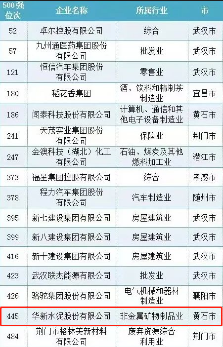 (三)9月12日,全国工商联发布“2023中国民营企业500强”榜单和《2023中国民营企业500强调研分析报告》。湖北16家企业上榜、黄石2家企业榜上有名,其中武汉市黄石商会党委书记单位——华新水泥股份有限公司排名445位!《点击链接查看全文》