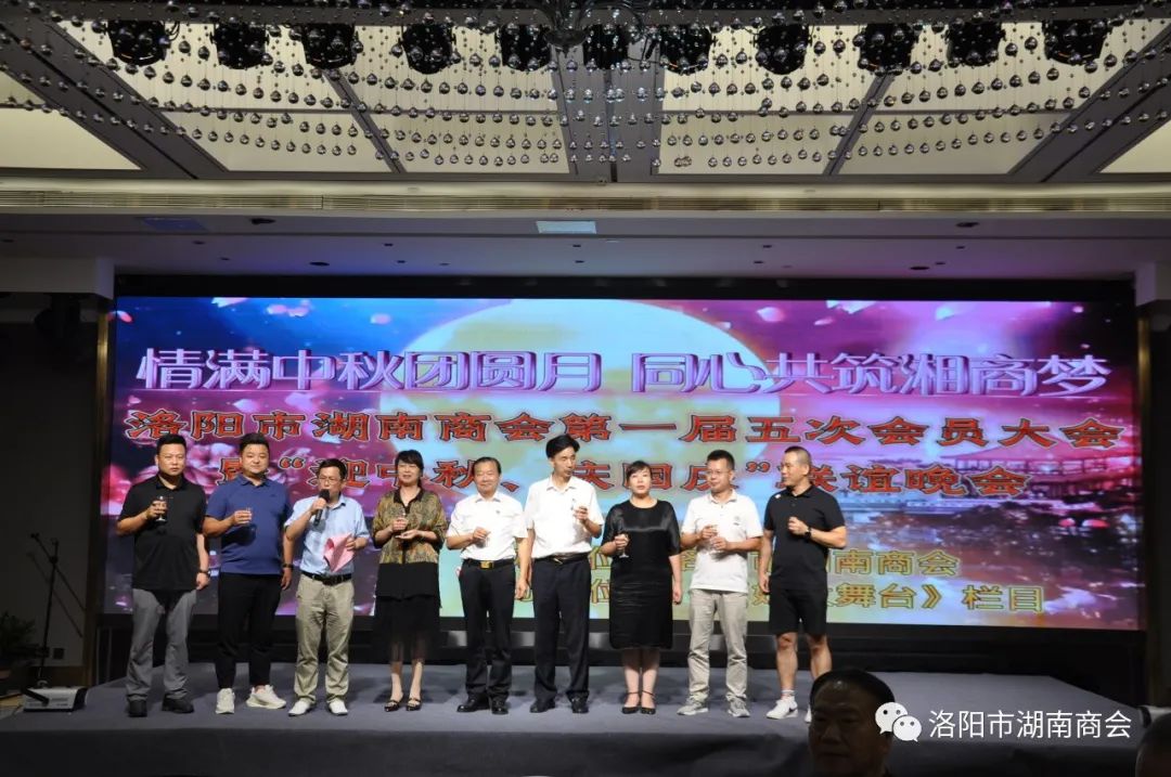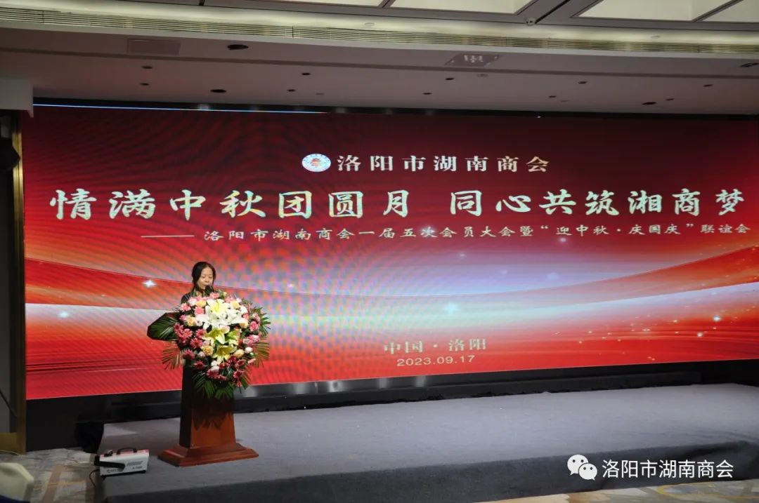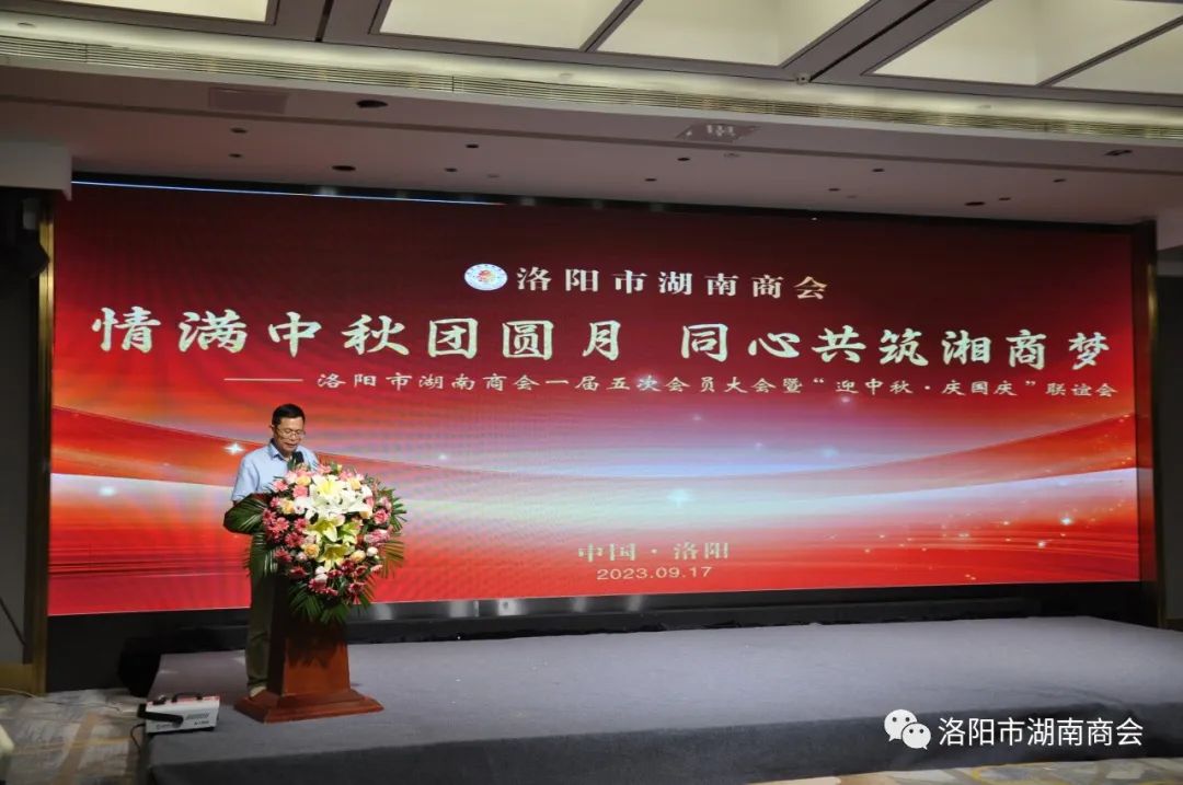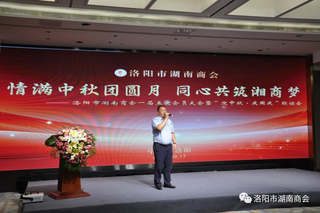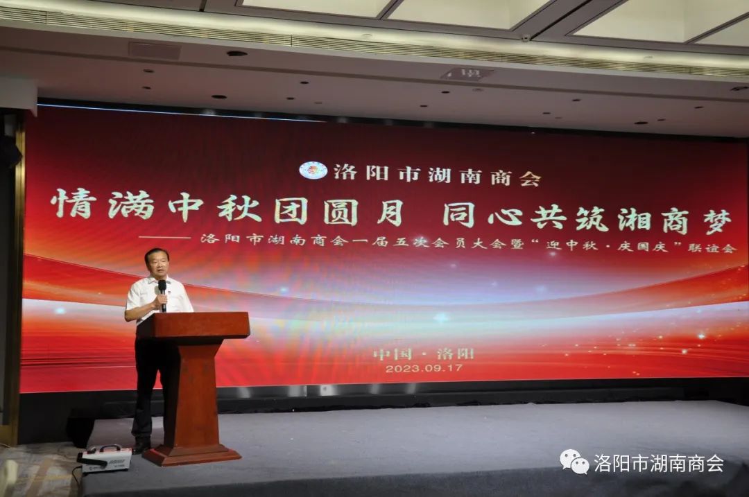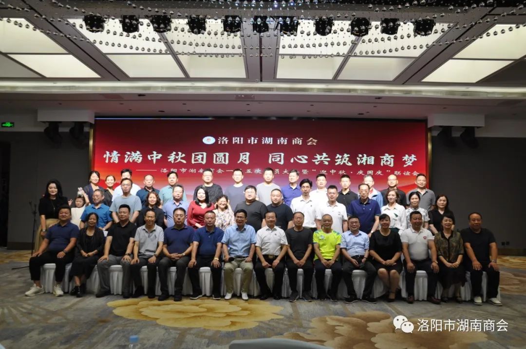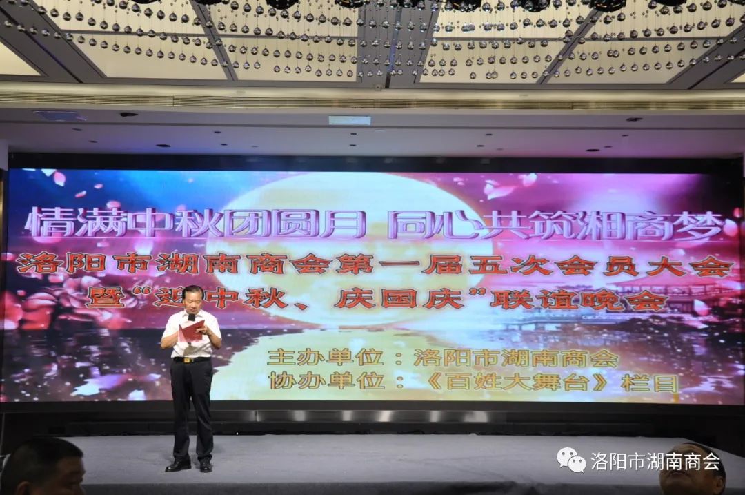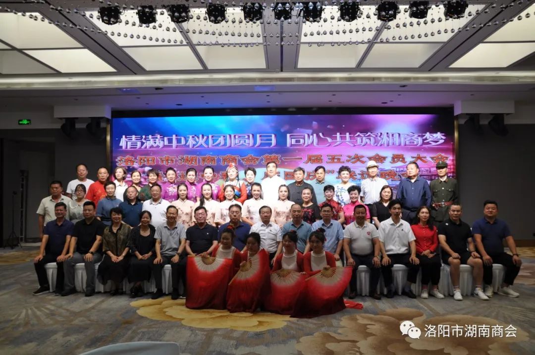金秋送爽,丹桂飘香,春华秋实,湘情永驻。9月17日,在这丰收喜悦季节,洛阳市湖南商会第一届五次会员大会暨“迎中秋、庆国庆”联谊晚会在牡丹城宾馆隆重召开。参加会议的主要领导及嘉宾有:市工商联主席、市工商联总商会会长侯建军,市工商联党组成员、二级调研员朱军朝,涧西区委统战部副部长,区工商联党组书记王海波,原中国航空工业集团总公司613研究所所长张雄安,河南陆运购物中心集团有限公司董事长吴军平,郑州市株洲商会会长洪德良,洛阳市南阳商会会长张华周,洛阳市石油商会会长史建伟,洛阳市豫东商会会长柳向前,洛阳市甘肃商会会长王化斌及洛阳市浙江商会秘书长杨格,还有来自于不同战线的湖南籍在洛军人、武警官兵、消防战士、科技工作者以及湖南商会全体会员和部分家属等共150余人欢聚一堂,同叙思湘之情,共庆中秋佳节。