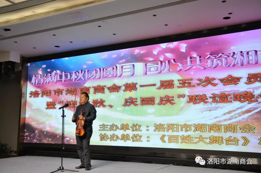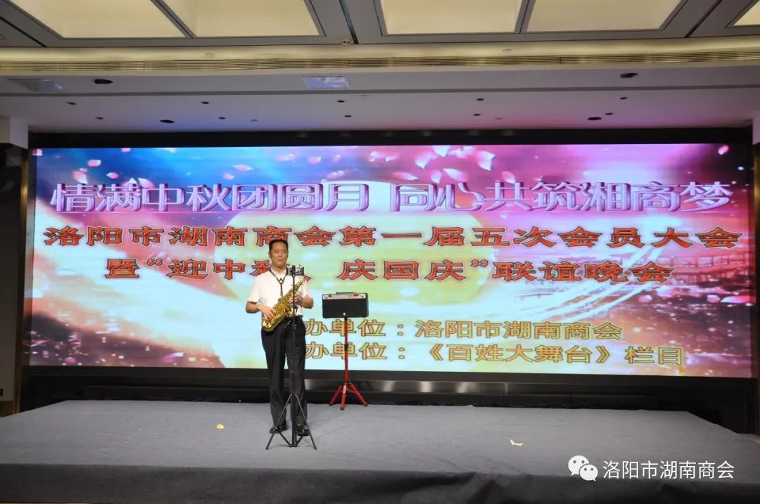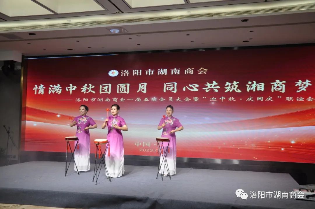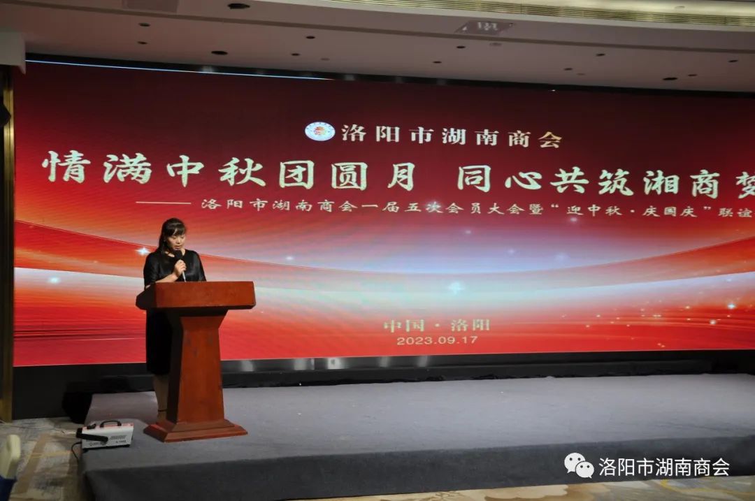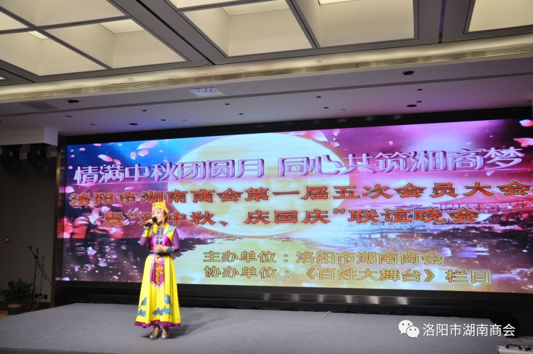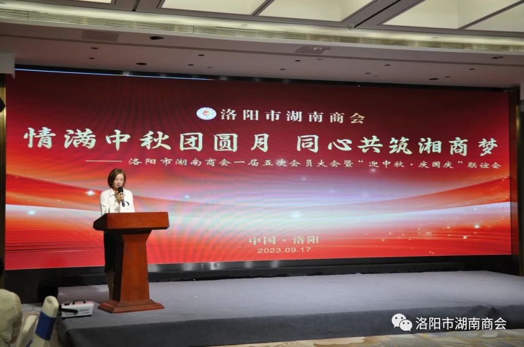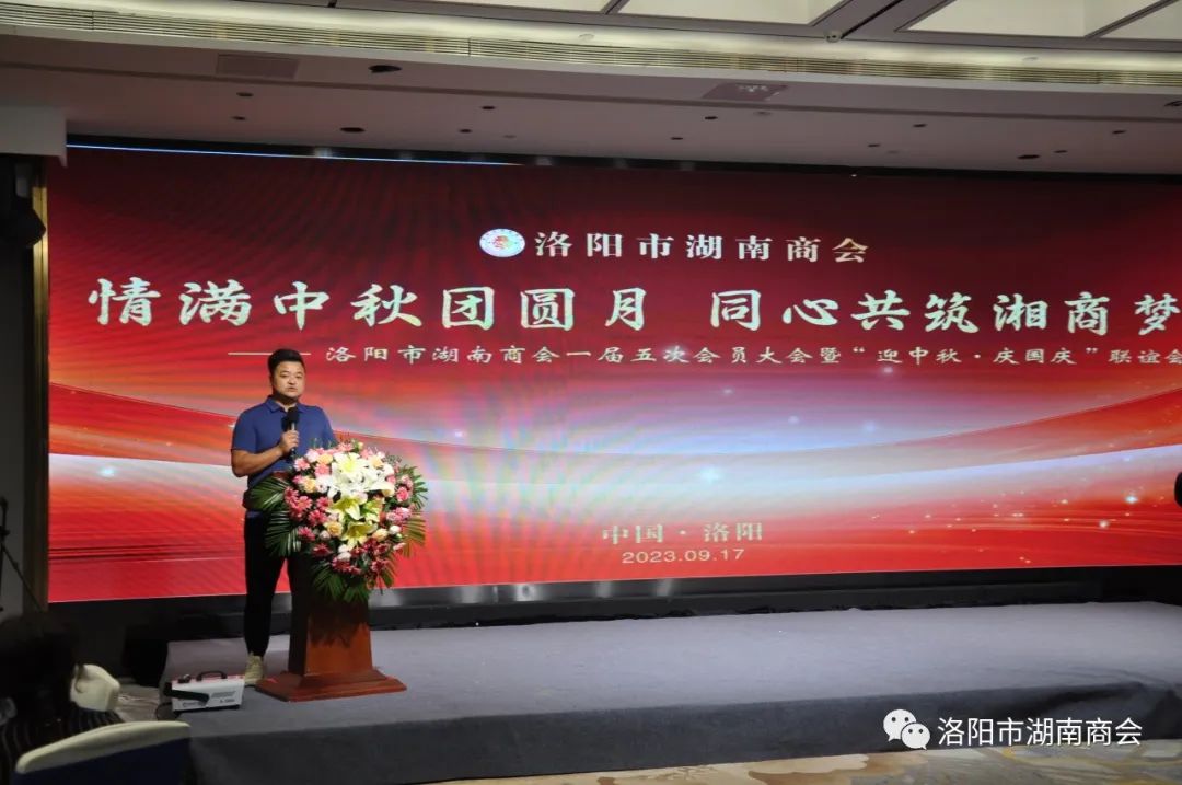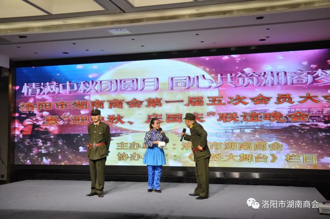 金秋送爽,丹桂飘香,春华秋实,湘情永驻。9月17日,在这丰收喜悦季节,洛阳市湖南商会第一届五次会员大会暨“迎中秋、庆国庆”联谊晚会在牡丹城宾馆隆重召开。参加会议的主要领导及嘉宾有:市工商联主席、市工商联总商会会长侯建军,市工商联党组成员、二级调研员朱军朝,涧西区委统战部副部长,区工商联党组书记王海波,原中国航空工业集团总公司613研究所所长张雄安,河南陆运购物中心集团有限公司董事长吴军平,郑州市株洲商会会长洪德良,洛阳市南阳商会会长张华周,洛阳市石油商会会长史建伟,洛阳市豫东商会会长柳向前,洛阳市甘肃商会会长王化斌及洛阳市浙江商会秘书长杨格,还有来自于不同战线的湖南籍在洛军人、武警官兵、消防战士、科技工作者以及湖南商会全体会员和部分家属等共150余人欢聚一堂,同叙思湘之情,共庆中秋佳节。