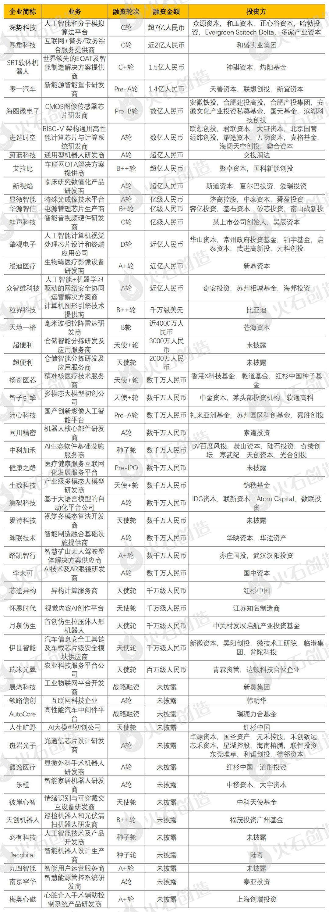 本月份人工智能行业融资事件TOP50