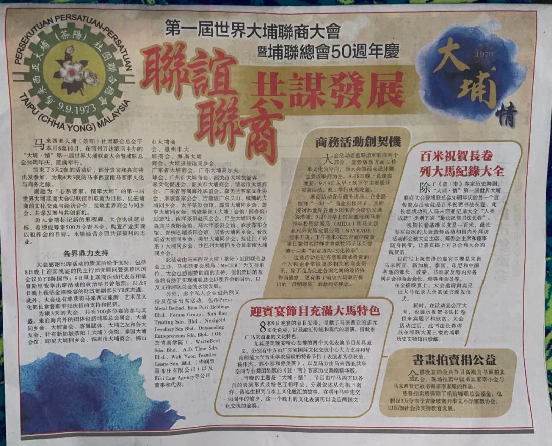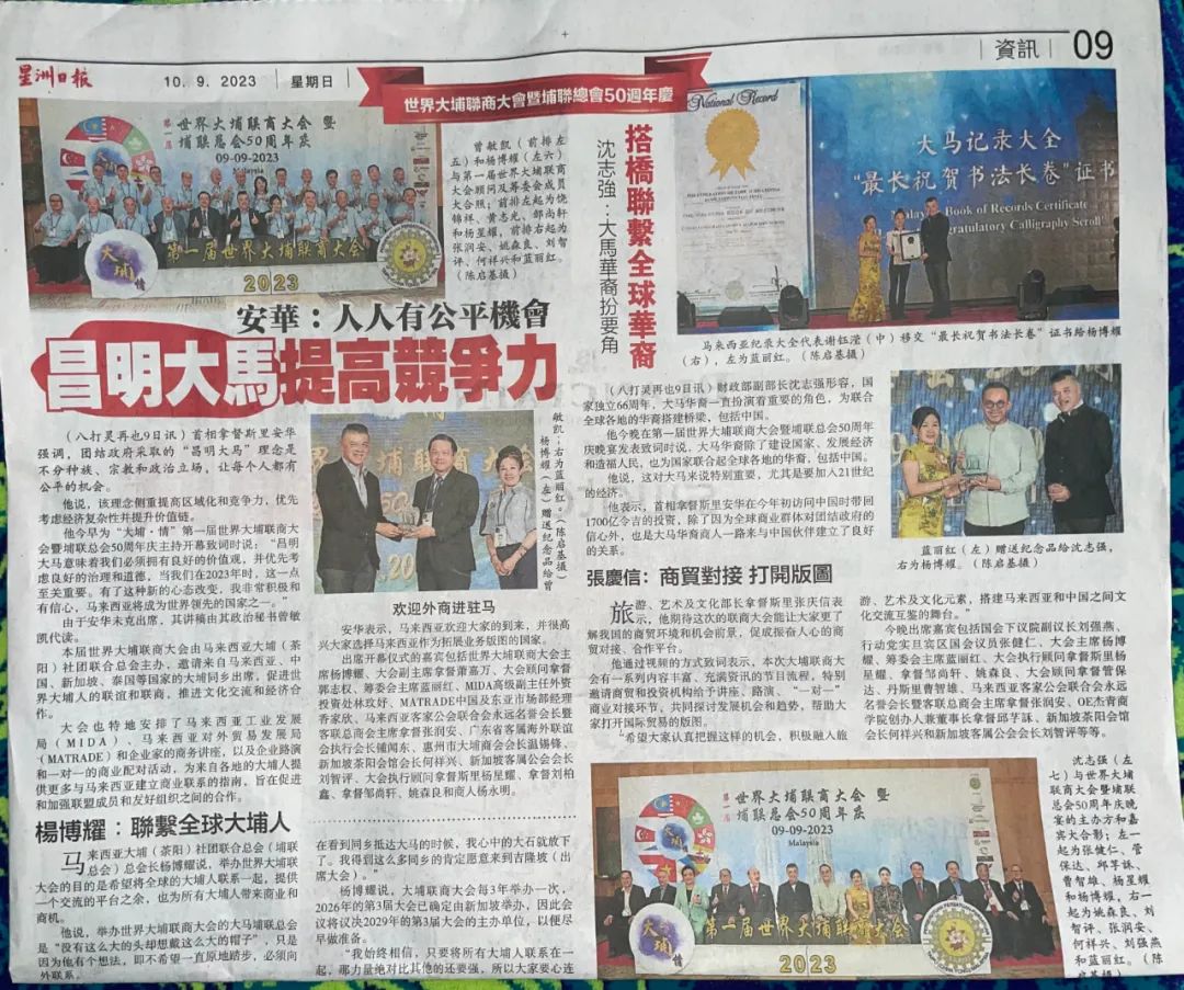 杨博耀会长胜意拳拳,2023年多次回国邀请大埔各地社团出席由马来西亚举办的第一届世界大埔联商大会暨埔联总会50周年庆活动。广州市大埔商会张钢仁会长郑重其事,组织商会一干成员依约赴南洋,正如罗卓英将军诗云:此行岂为稻梁谋,只为莫负栽花约。