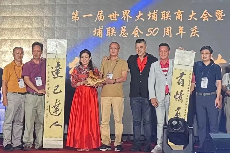 广州市大埔商会敬赠一尊崖柏工艺品及陈永斌老师书写的一副对联“有情有义;达己达人”表达了对海外埔人及马来西亚大埔(茶阳)社团联合总会崇高的敬意。