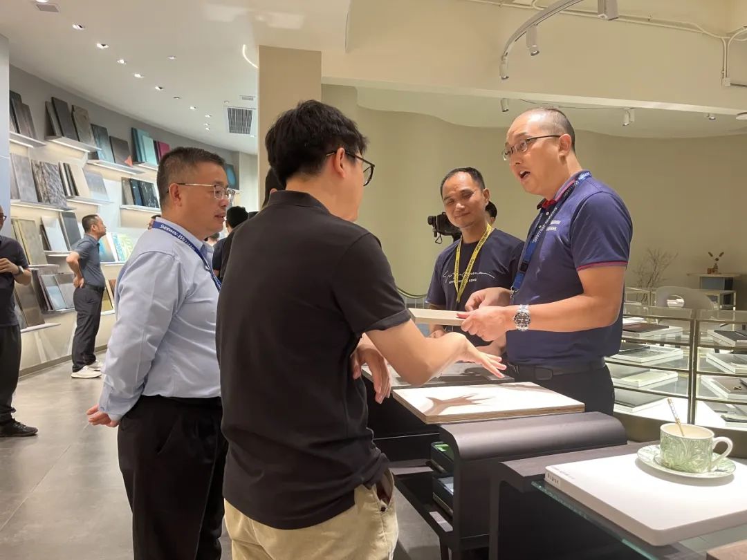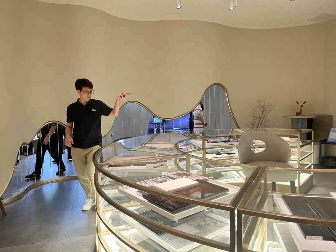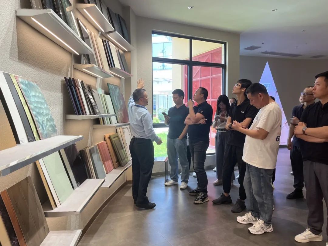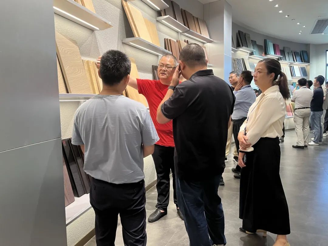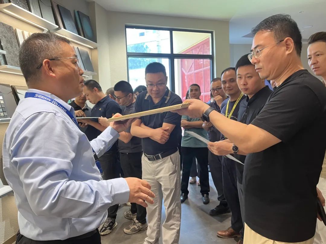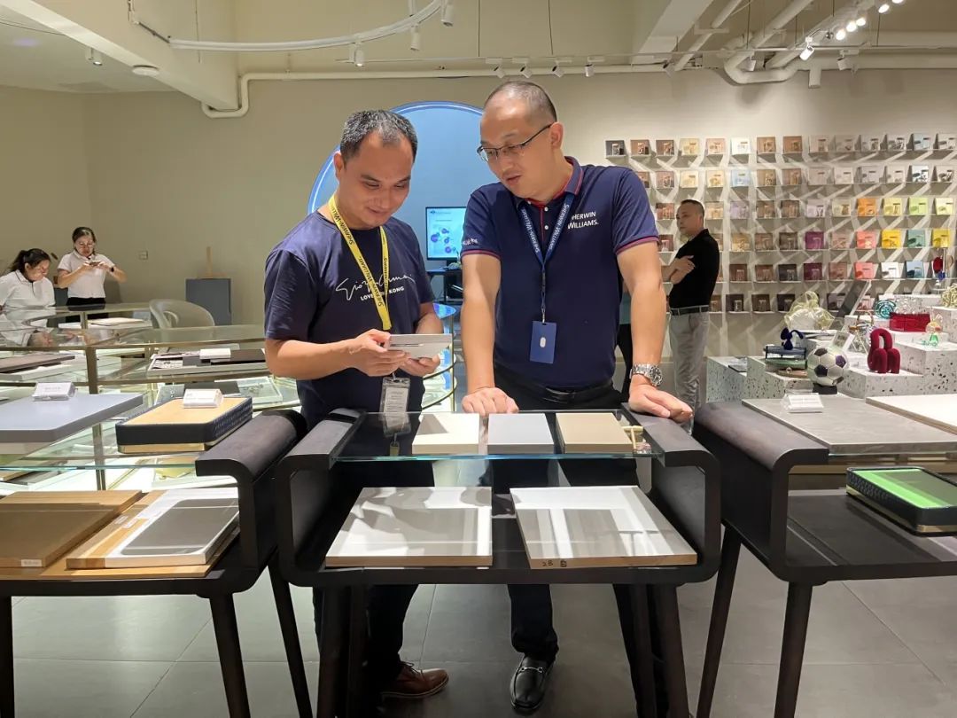 分享过后,参会来宾共同参观宣伟展示中心和气评中心。展示中心展示了各类涂装效果色板,满足各品类家居产品涂装需求,是设计灵感汇聚地。而气评中心则提供了专业的气体技术评估。来宾们积极探讨色彩特点和应用场景,为企业产品开发新涂装效果寻找灵感。