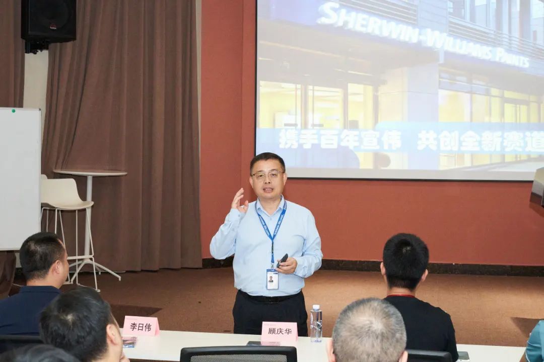 承办单位宣伟涂料中国区销售总经理宣伟顾庆华先生进行致辞。他表示作为全球知名涂料供应商,宣伟不仅为各地客户提供丰富的涂料产品及解决方案,更致力于色彩的研究并提供色彩预测与设计等多种服务支持。希望大家能在本次交流会不仅收获家居色彩潮流趋势,更能加深对橱柜色彩的理解,为企业产品拓展色彩优势。