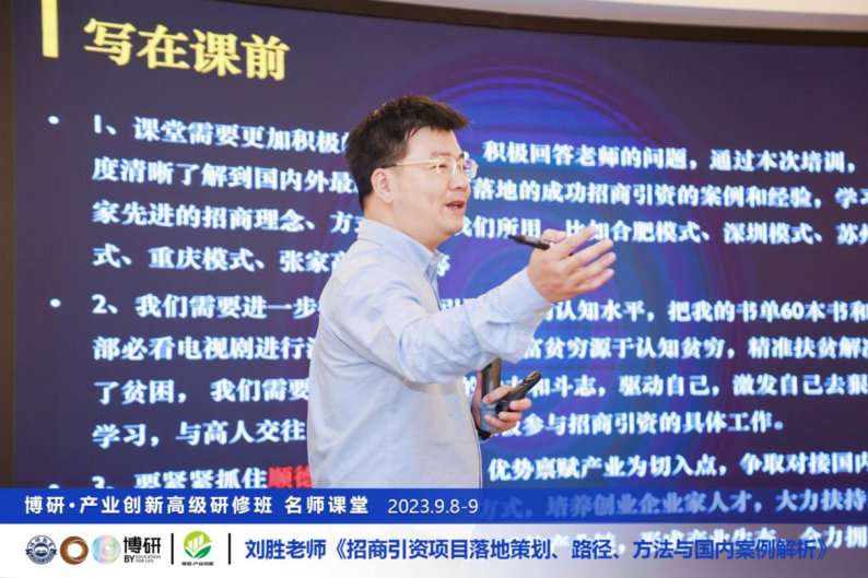 2023年9月,博研产业创新班的开课在顺德华桂园举行,课程主题为《招商引资项目落地策划、路径、方法与国内案例解析》。本课程核心主旨是通过对国内外最具参考性的招商引资成功案例进行分析研究,采用理论结合实际的方式,让企业管理者了解和学习先进的招商理念和模式方法,提升招商引资认识水平和实操能力。课程时间为8日-9日两天封闭式学习。