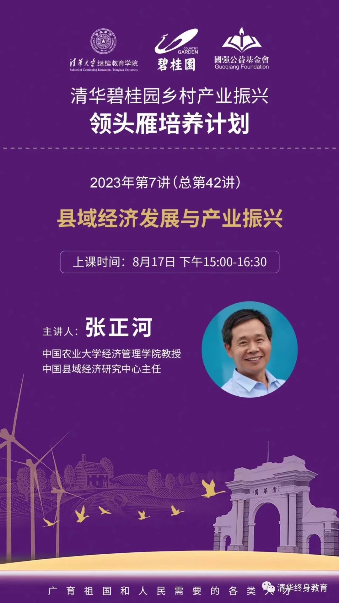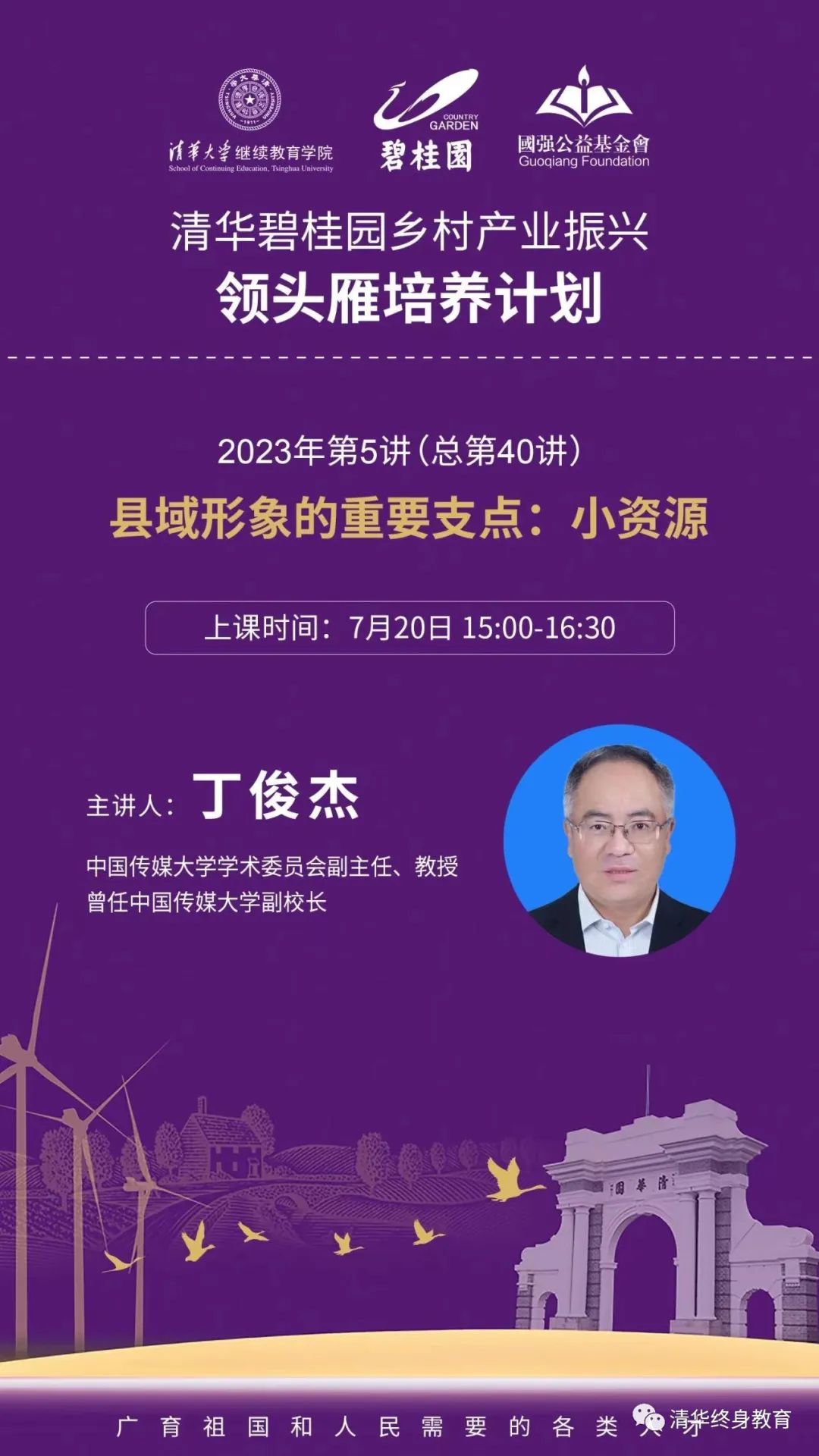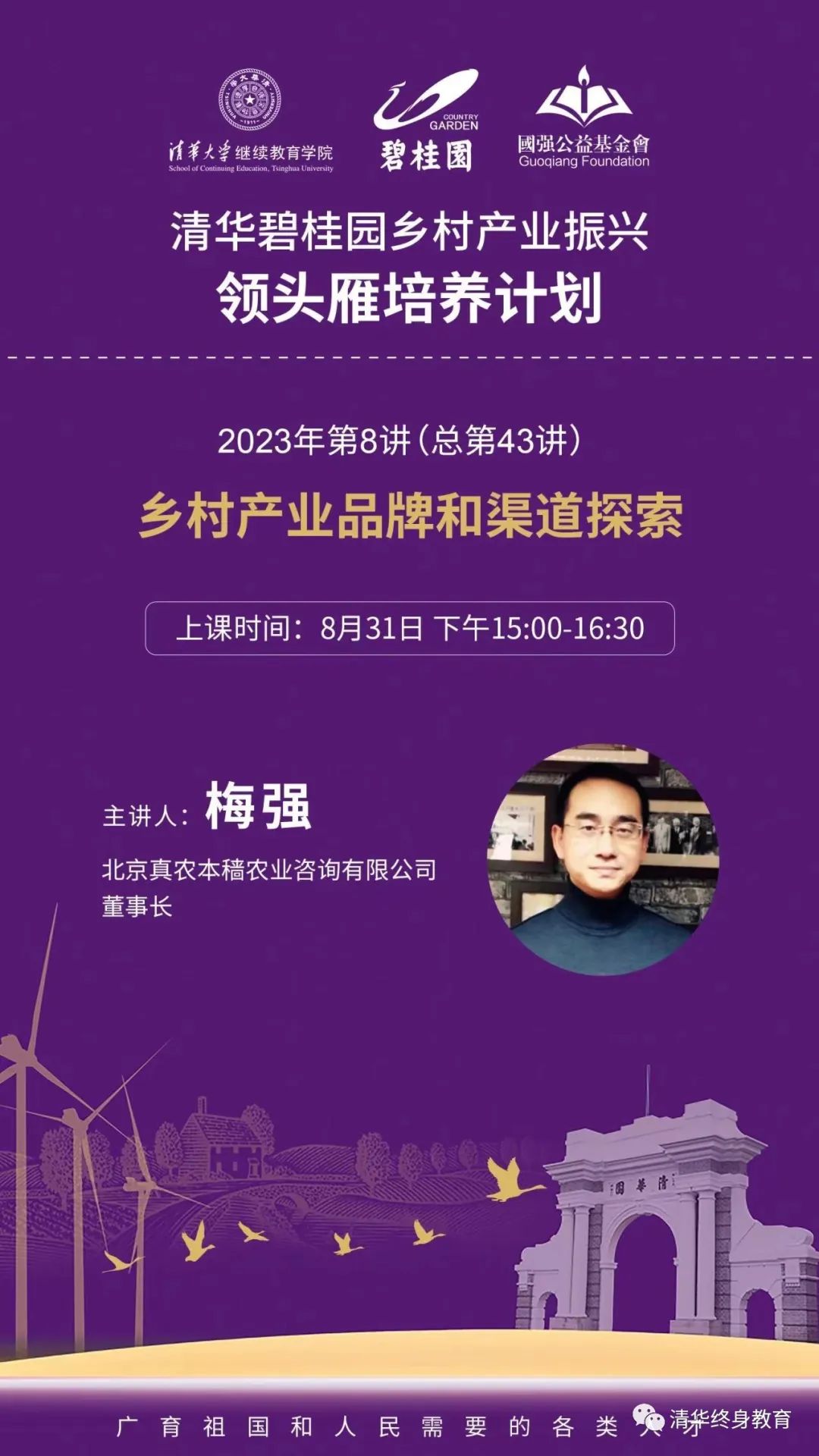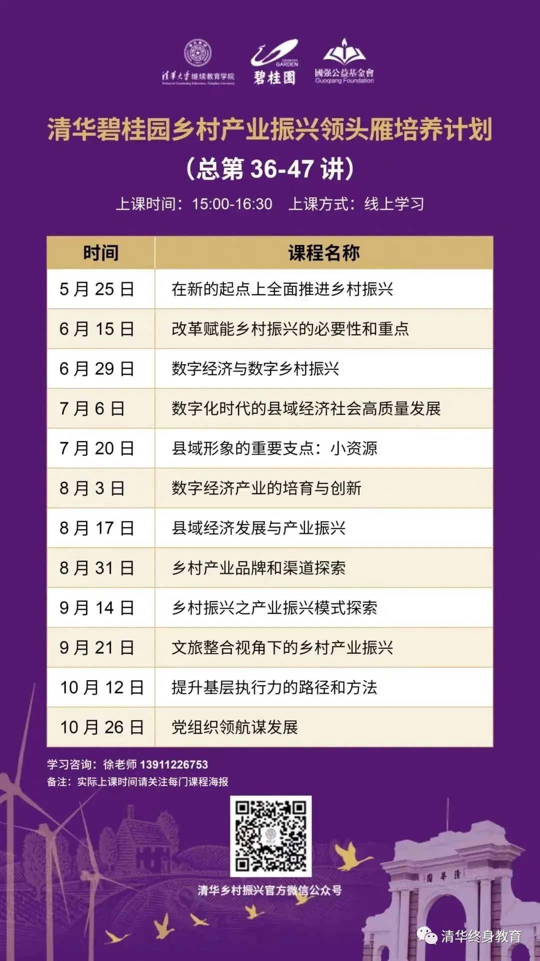 5月,清华大学联合碧桂园、国强公益基金会再度启动“清华碧桂园乡村产业振兴领头雁培养计划”,讲授主题包括“三农前沿”、“县域发展”、“数字经济”、“产业振兴”、“乡村队伍建设”等。目前已开展44讲。