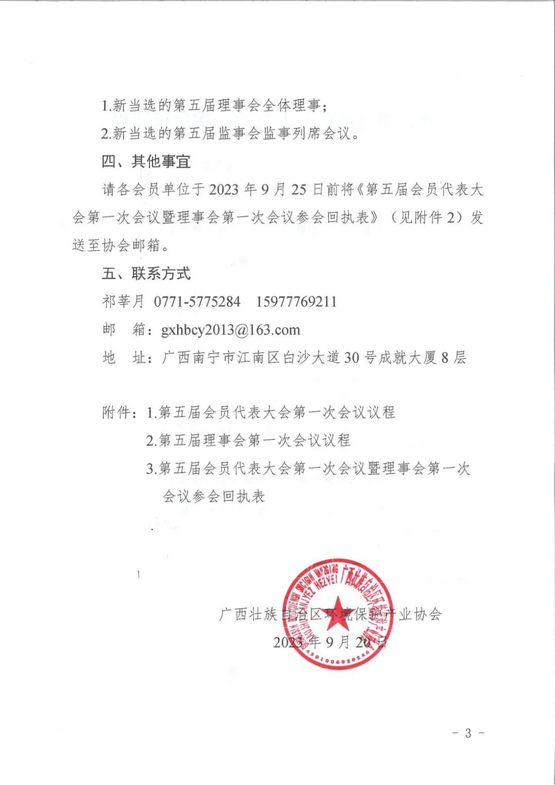 经研究,我会定于2023年10月11日在南宁召开广西环保产业协会第五届会员代表大会第一次会议暨理事会第一次会议,事关协会换届重要会议,请各会员单位按时参加会议。请参会单位于2023年9月25日12:00前将参会回执表发至协会邮箱:gxhbcy2013@163.com。