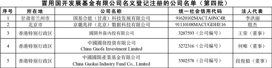 近期,国开发展基金有限公司(以下简称“我公司”)发现不法分子通过伪造我公司证照和印章,在香港、北京、甘肃等地将5家企业(见附表)冒名登记为我公司下属子公司,并可能涉嫌以我公司名义开展经营活动的情形,其中部分企业涉嫌侵犯了“国开”字号、商标的权益,对我公司声誉造成不良影响。对此,我公司严正声明如下: